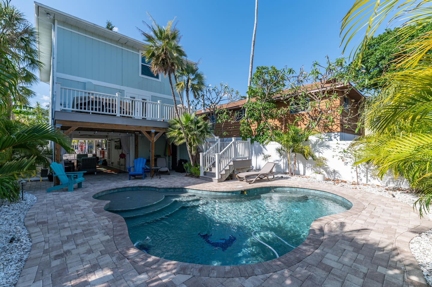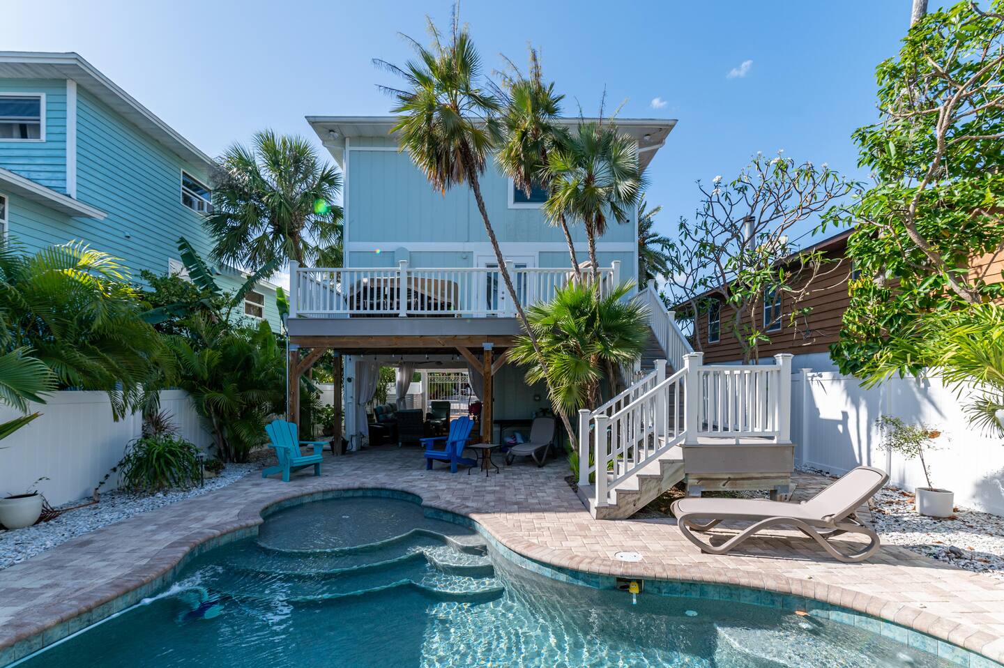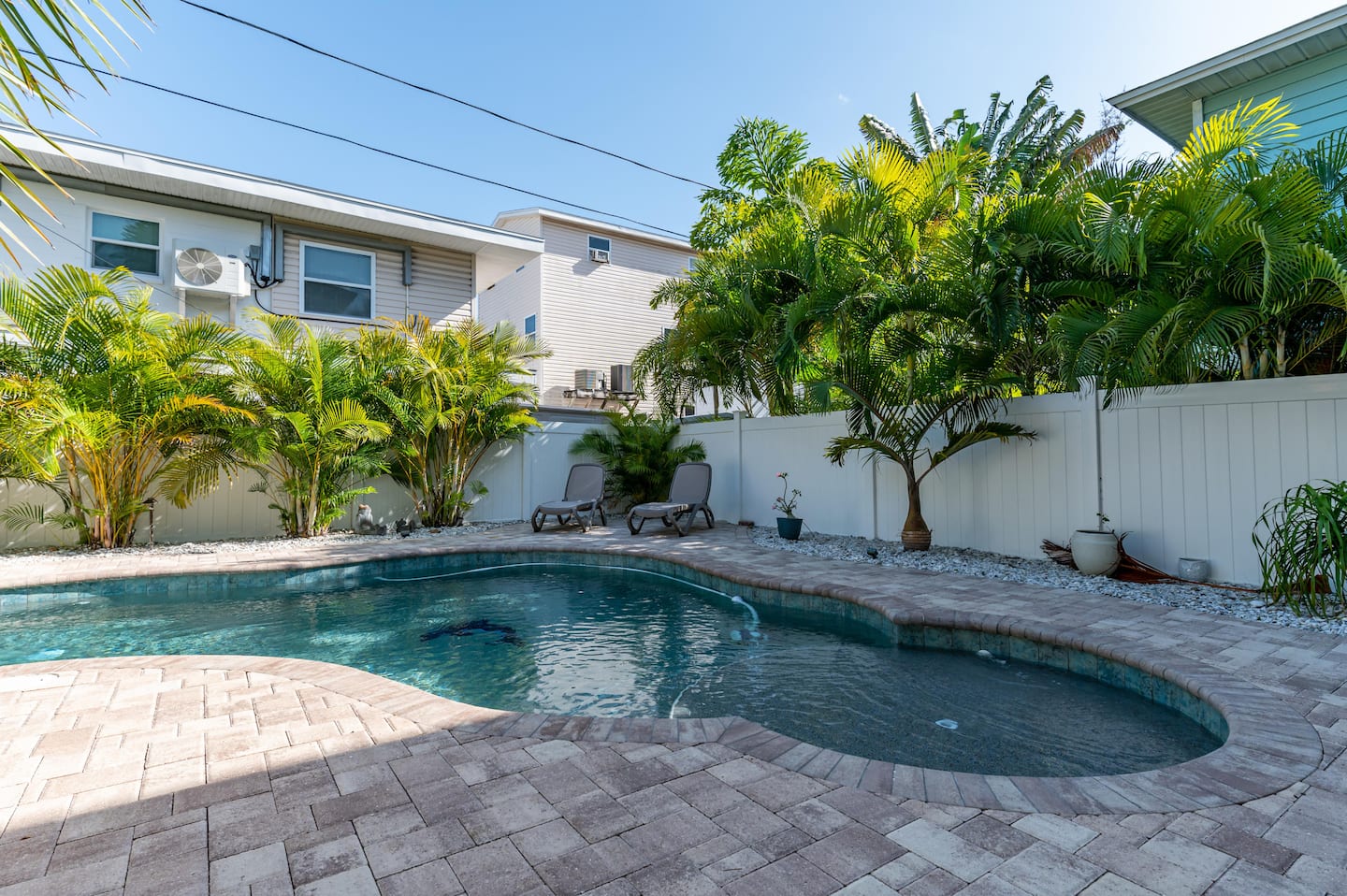 ❂ Private backyard with heated pool, sun loungers and tropical landscape