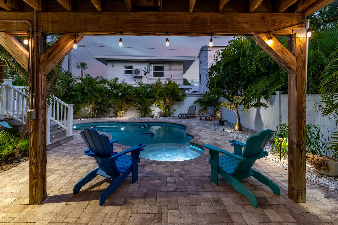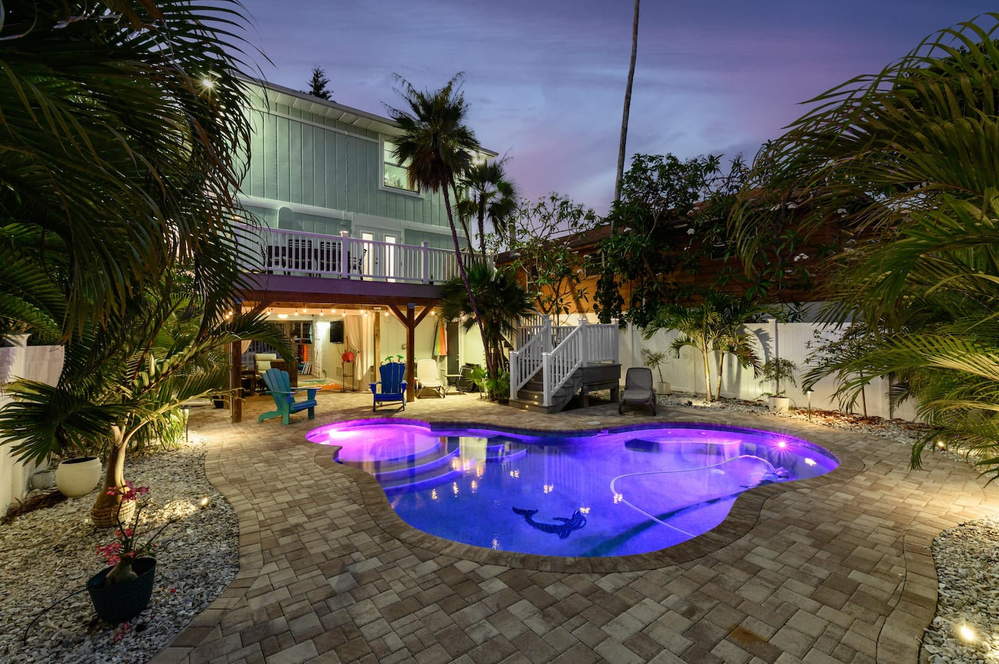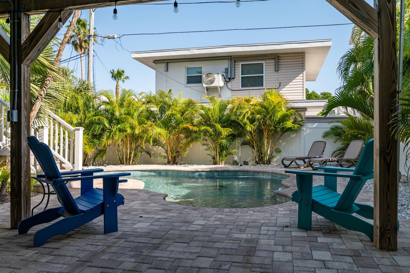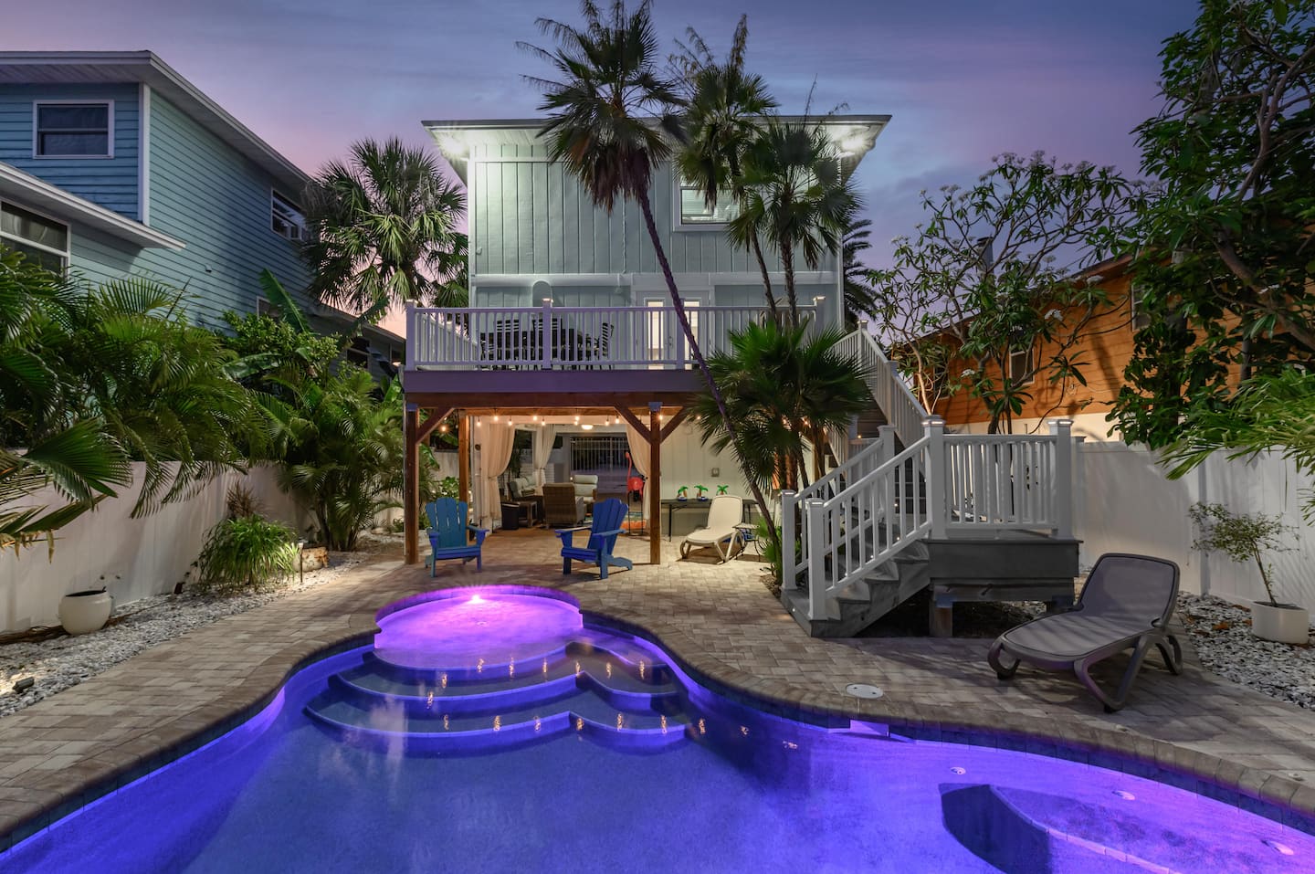 ❂ Private backyard with heated pool, sun loungers and tropical landscape
