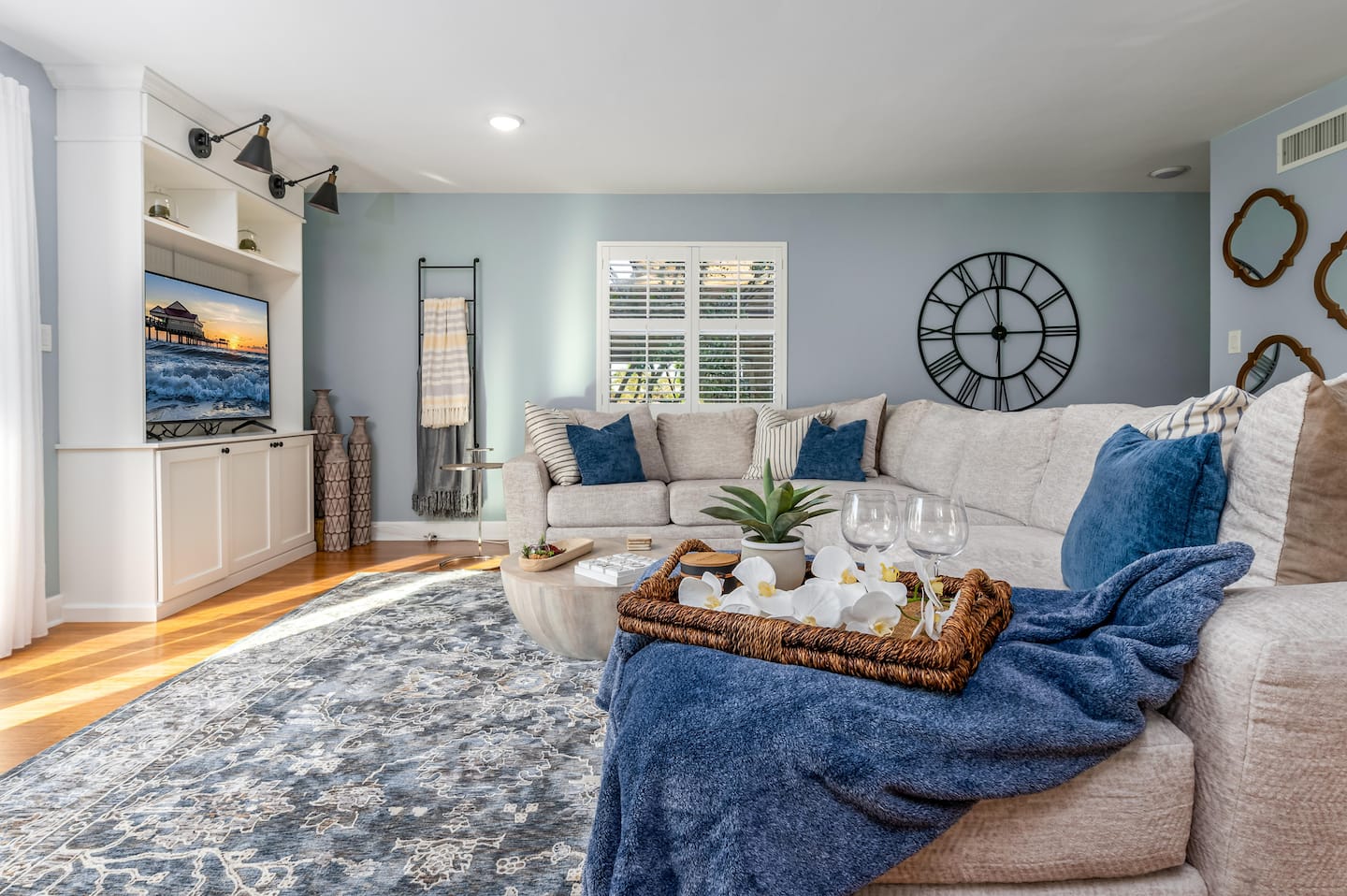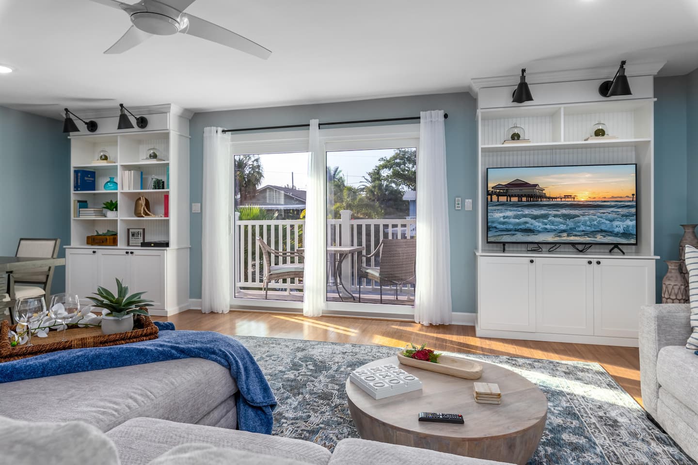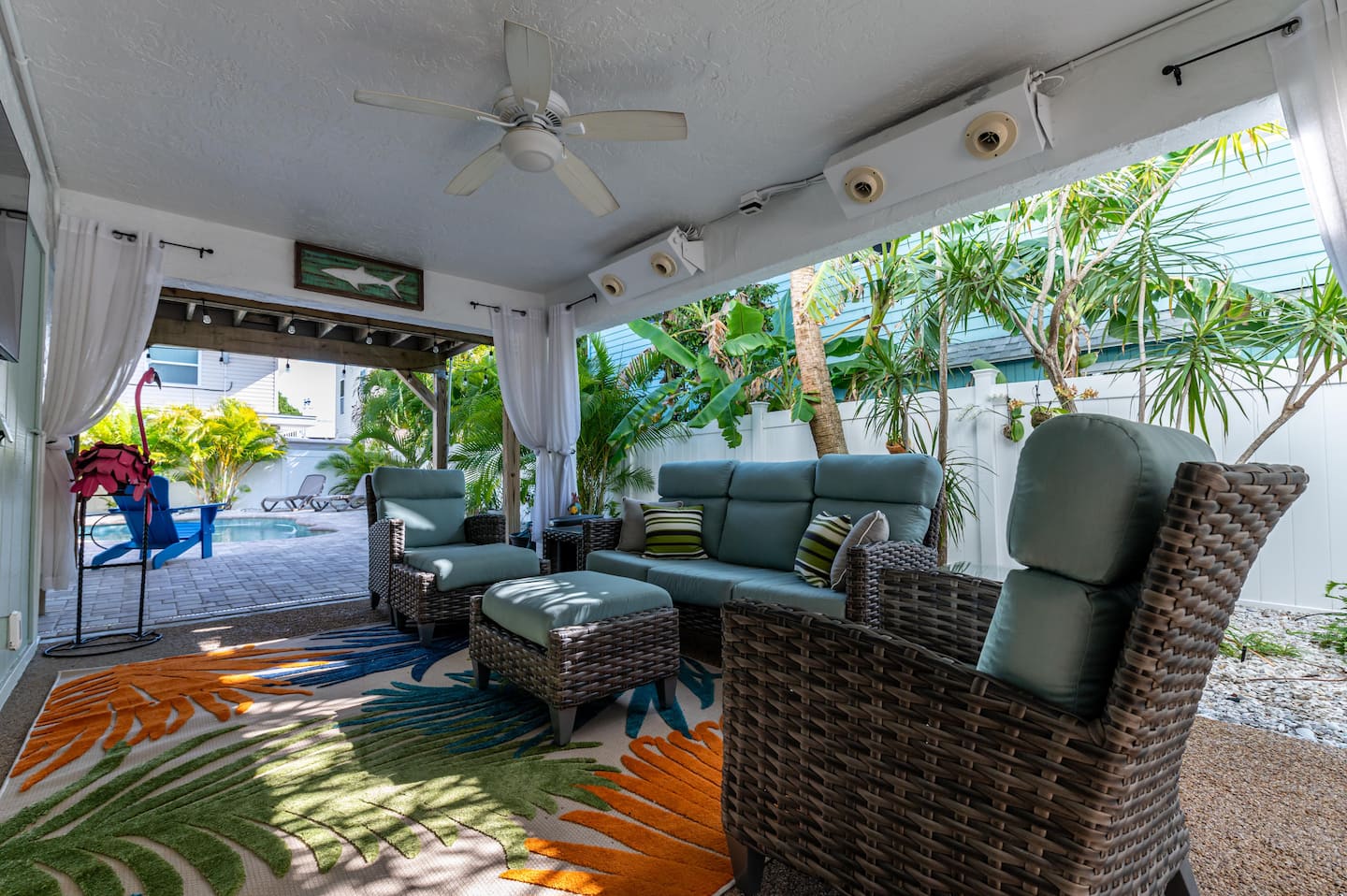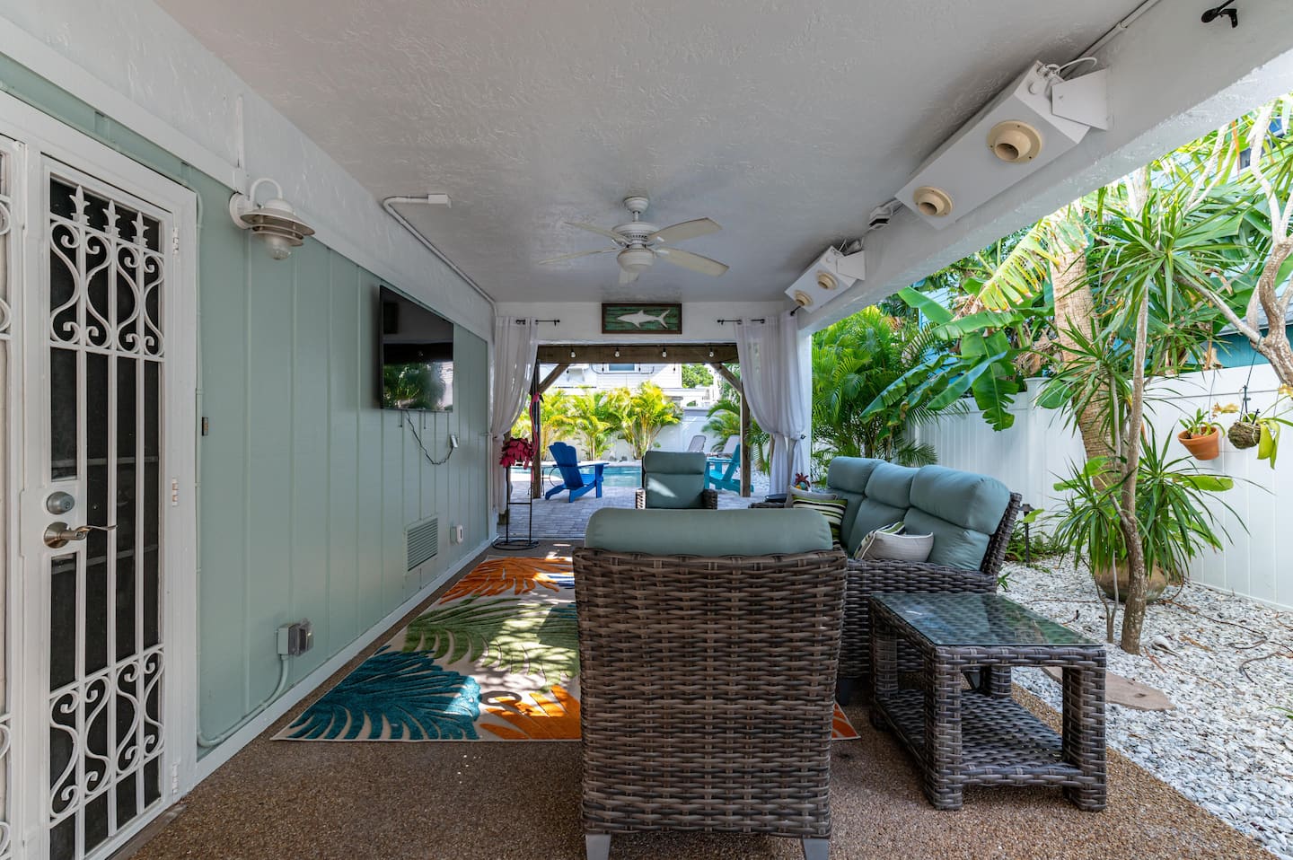 ❂ Outdoor covered living space with comfortable seating and smart TV