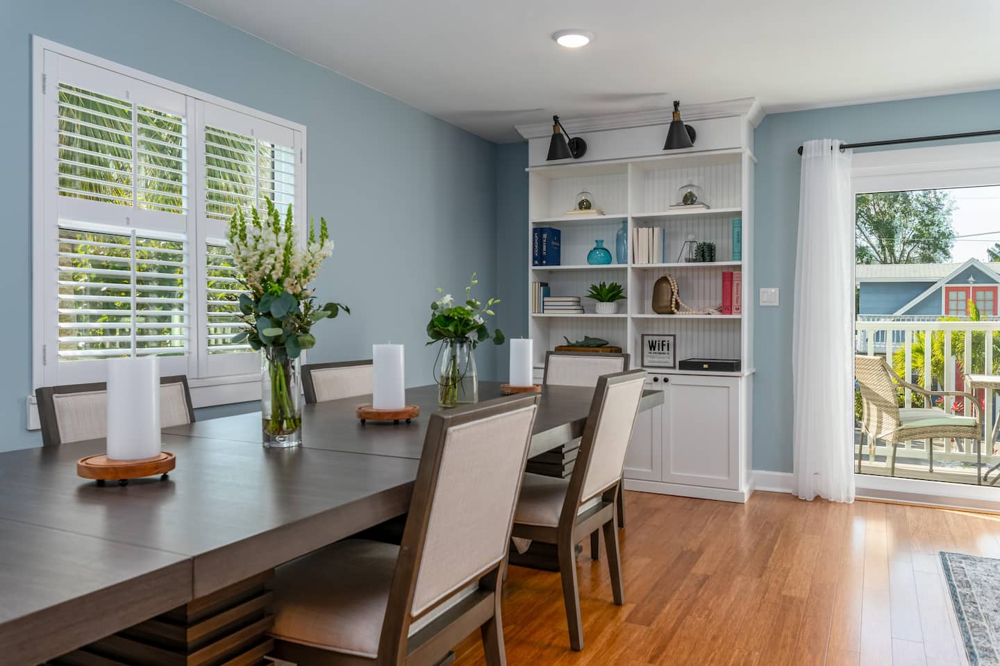 ❂ French doors that lead out to a large balcony with outdoor dining area and BBQ grill