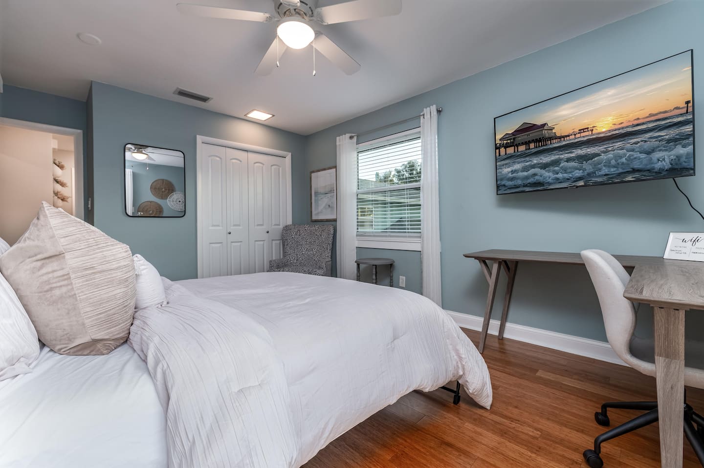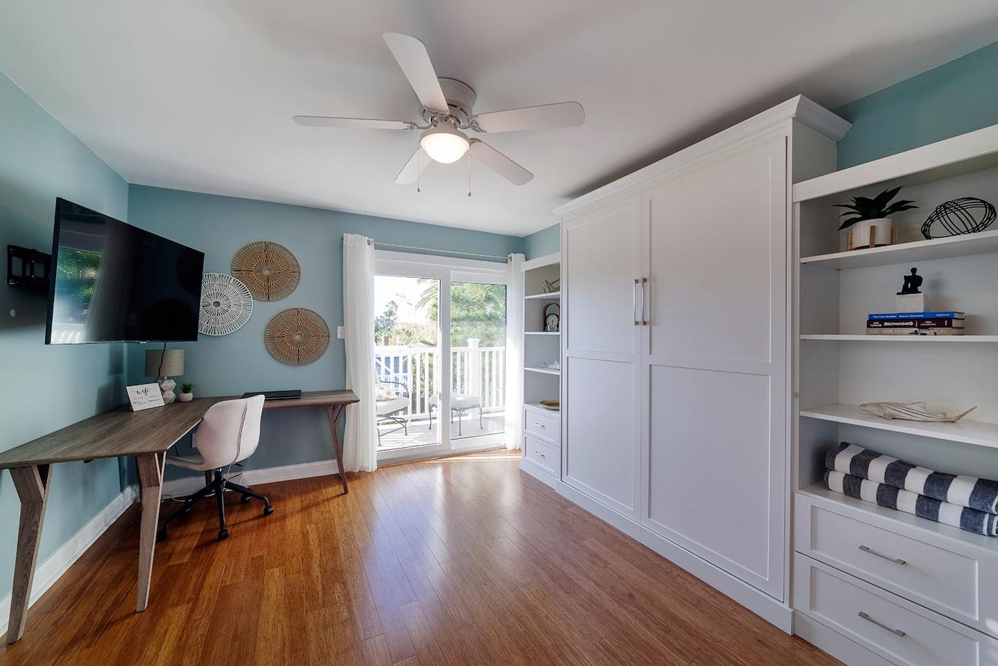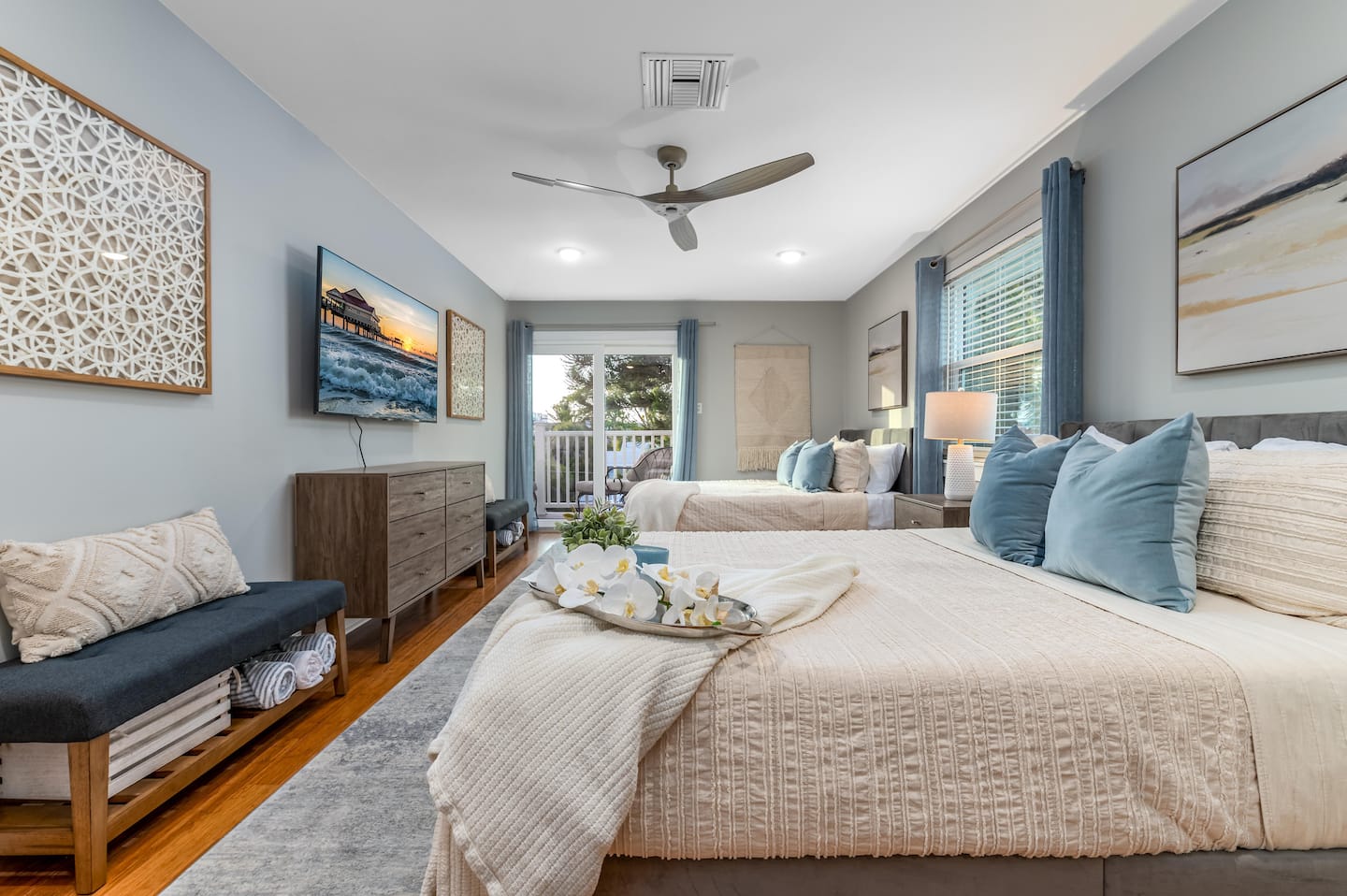 There’s 3 bedrooms total, all of which are located on the 3rd floor of the home. Bedroom #1 has a full sized bunk bed with a single trundle and private full bathroom. Bedroom #2 includes two queen sized beds, a flat screen TV, and access to the front balcony. Bedroom #3 can be used interchangeably as a home office or bedroom—it includes a queen size murphy bed, a flat screen TV, desk/workspace, and access to the front balcony. The 2nd and 3rd bedrooms share a full bathroom with a shower/tub combo and lots of counter space.