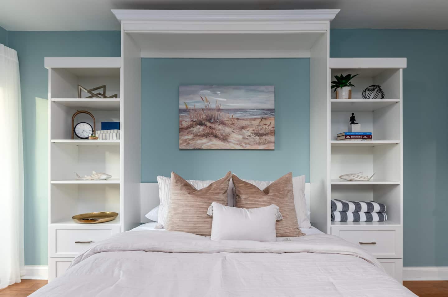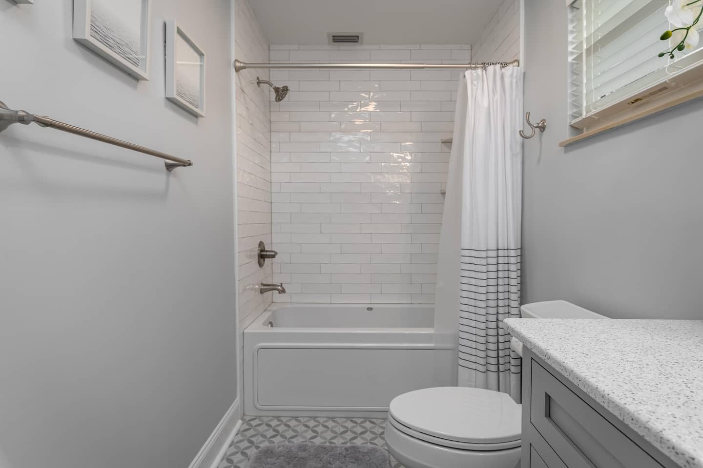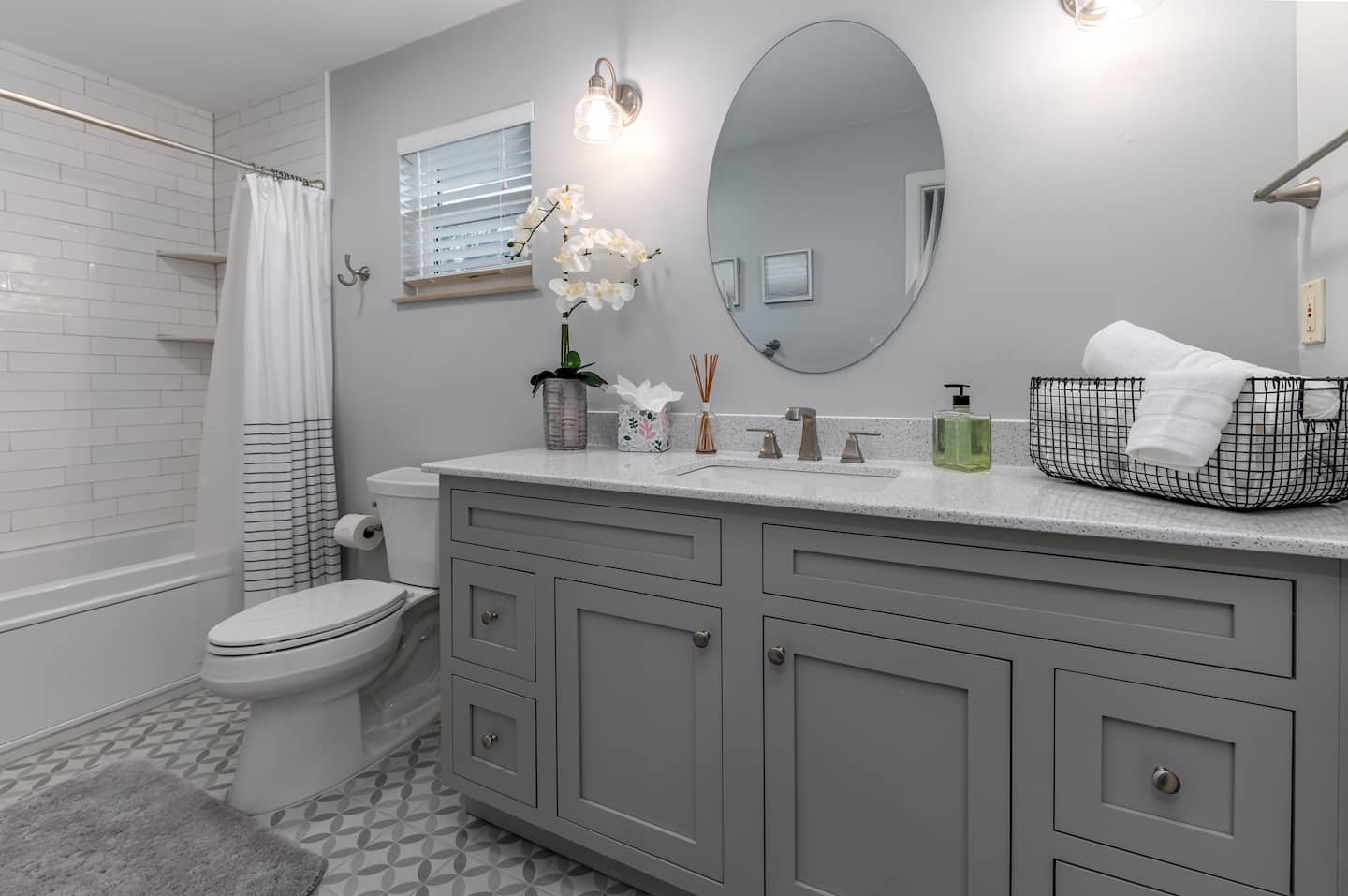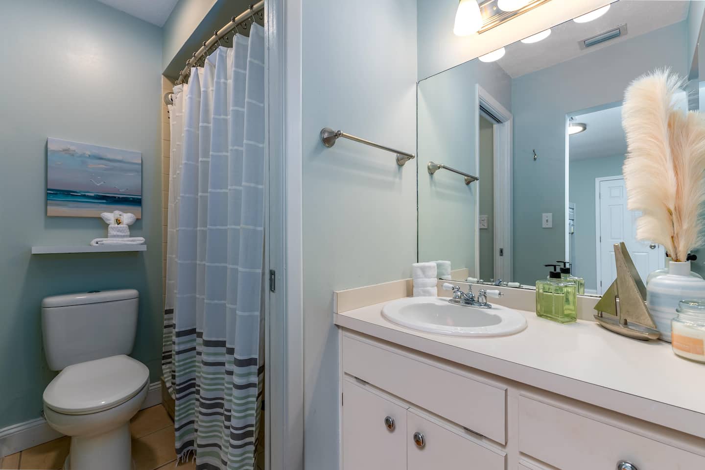 There’s 3 bedrooms total, all of which are located on the 3rd floor of the home. Bedroom #1 has a full sized bunk bed with a single trundle and private full bathroom. Bedroom #2 includes two queen sized beds, a flat screen TV, and access to the front balcony. Bedroom #3 can be used interchangeably as a home office or bedroom—it includes a queen size murphy bed, a flat screen TV, desk/workspace, and access to the front balcony. The 2nd and 3rd bedrooms share a full bathroom with a shower/tub combo and lots of counter space.