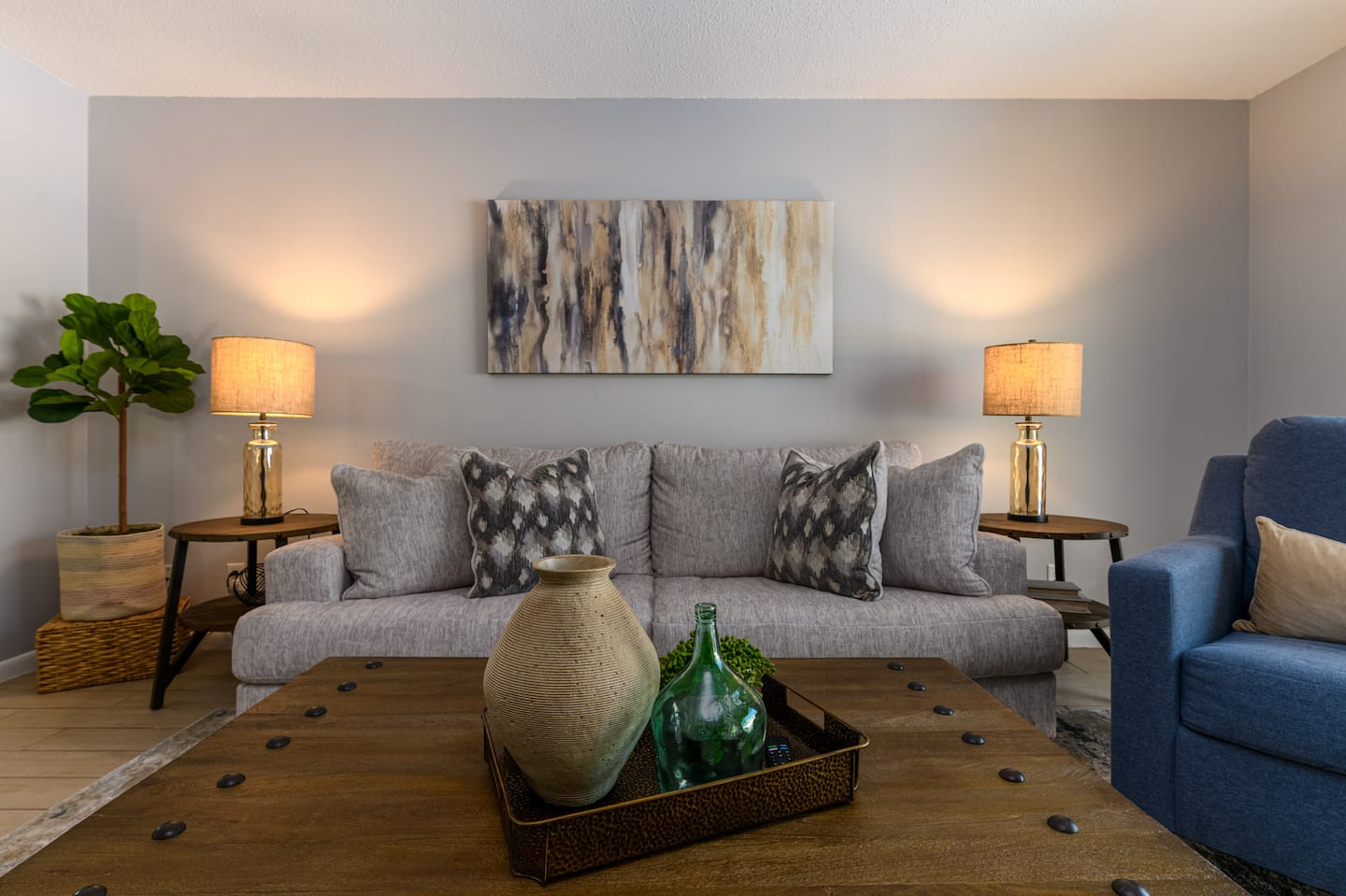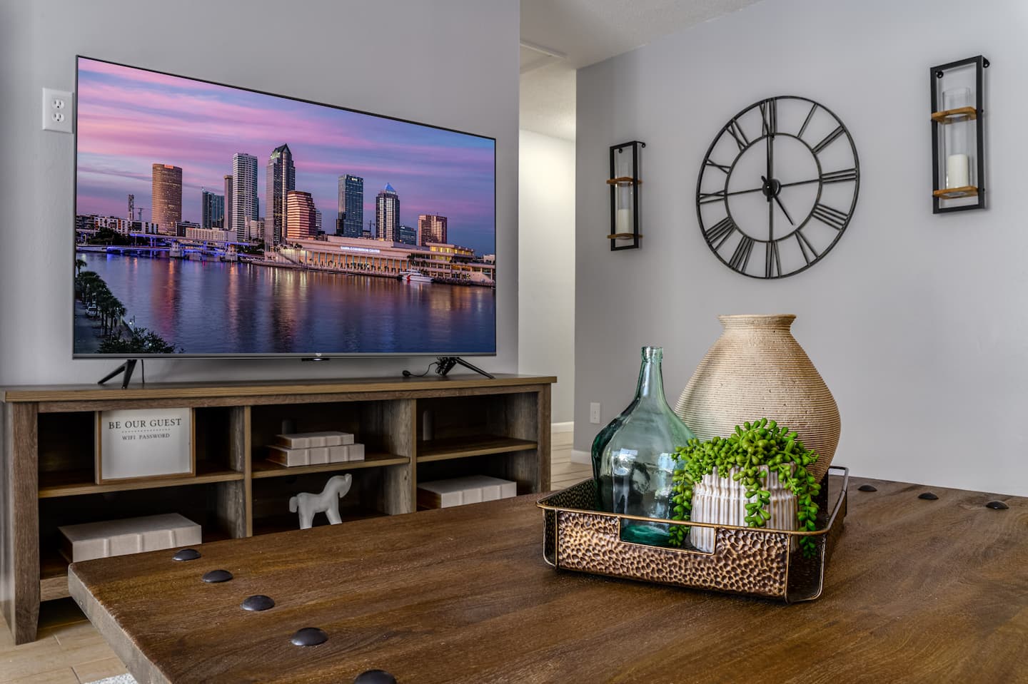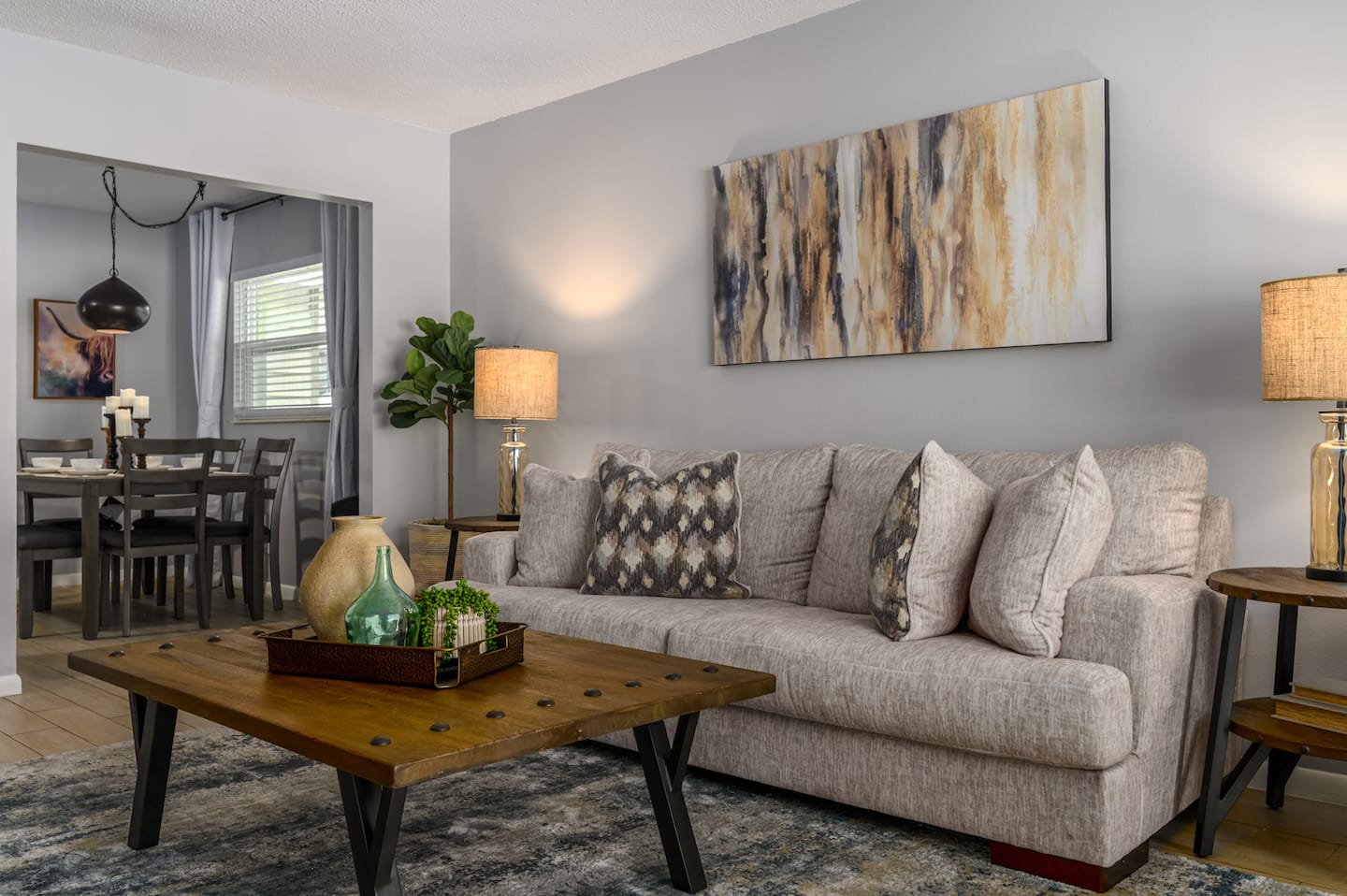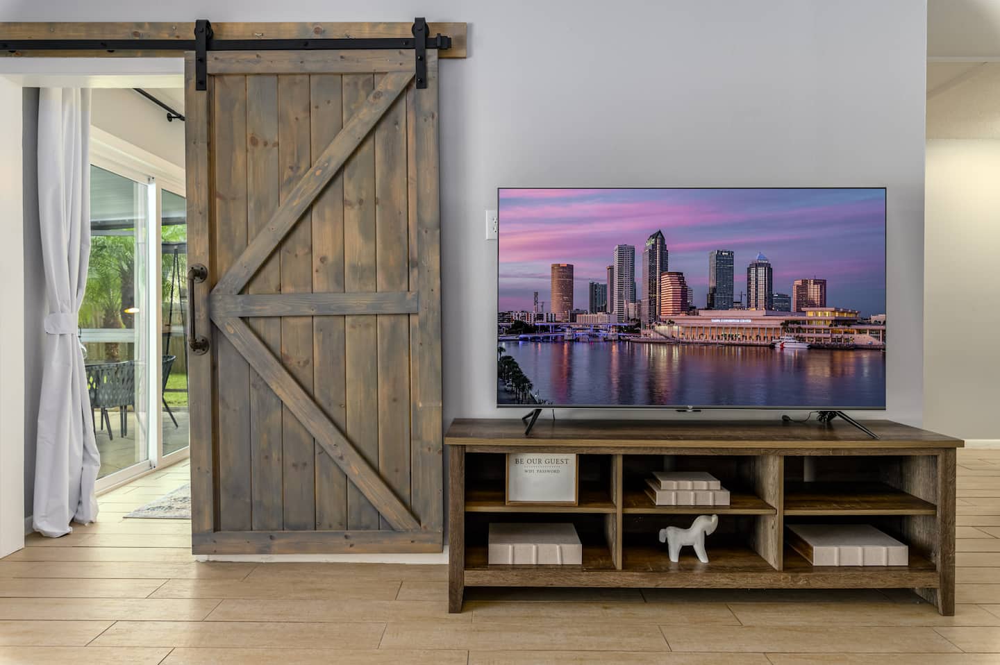 Unwind in the cozy living room after a day of adventure. Sink into the comfortable couch or sofa chair and enjoy your favorite movie or TV show on the flat-screen TV with streaming capabilities. Large sliding glass doors bring in natural light and offer direct access to the patio and pool, creating a warm and welcoming ambiance.