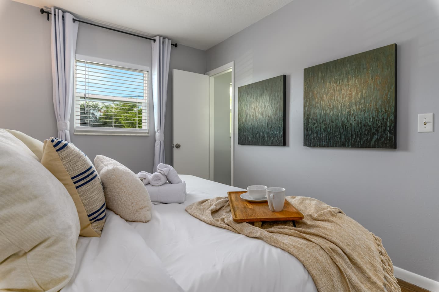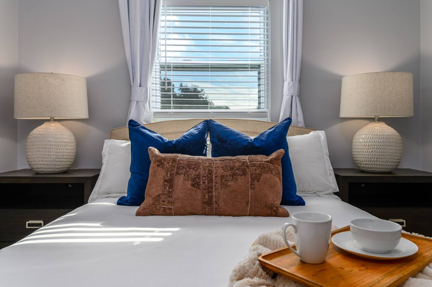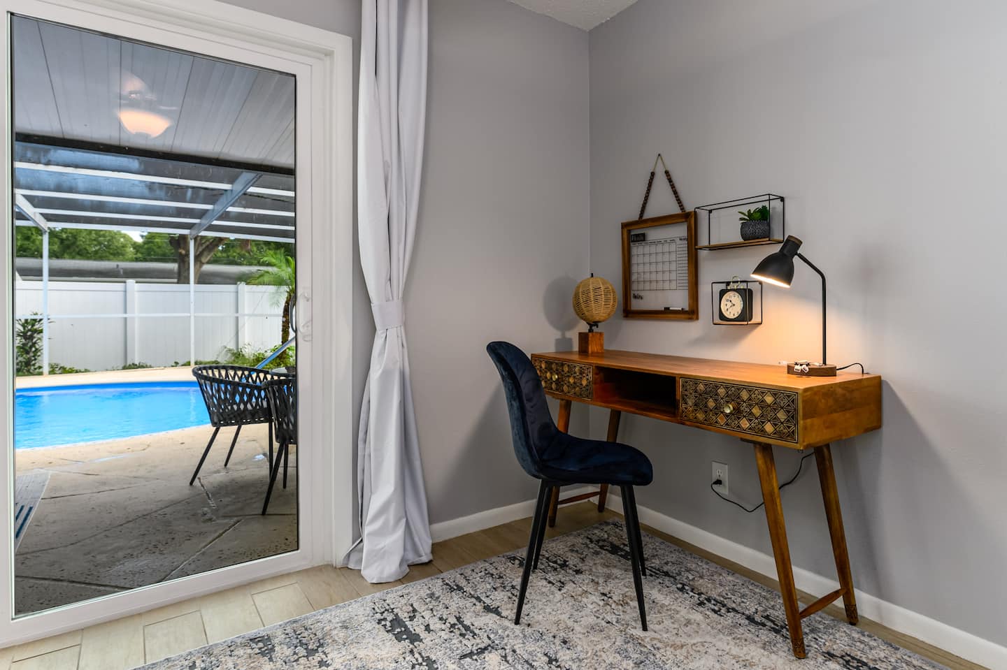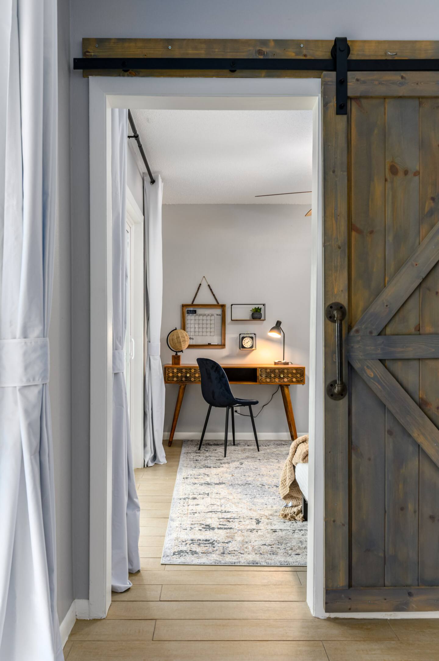 Experience comfort in our three bedrooms, accommodating up to six guests. The master bedroom features a luxurious king-sized bed, a spacious closet, and a private bathroom for added convenience. Meanwhile, the second bedroom, enclosed by a beautiful sliding barn door, offers a twin bed, ample storage space, access to the patio and pool, and a private workspace equipped with high-speed wifi. Bedroom three boasts a luxury full-sized bed and ample storage.