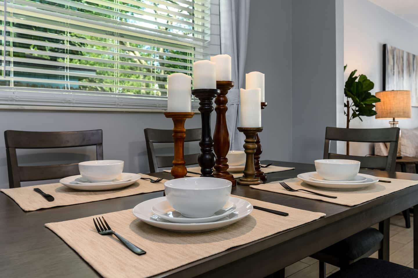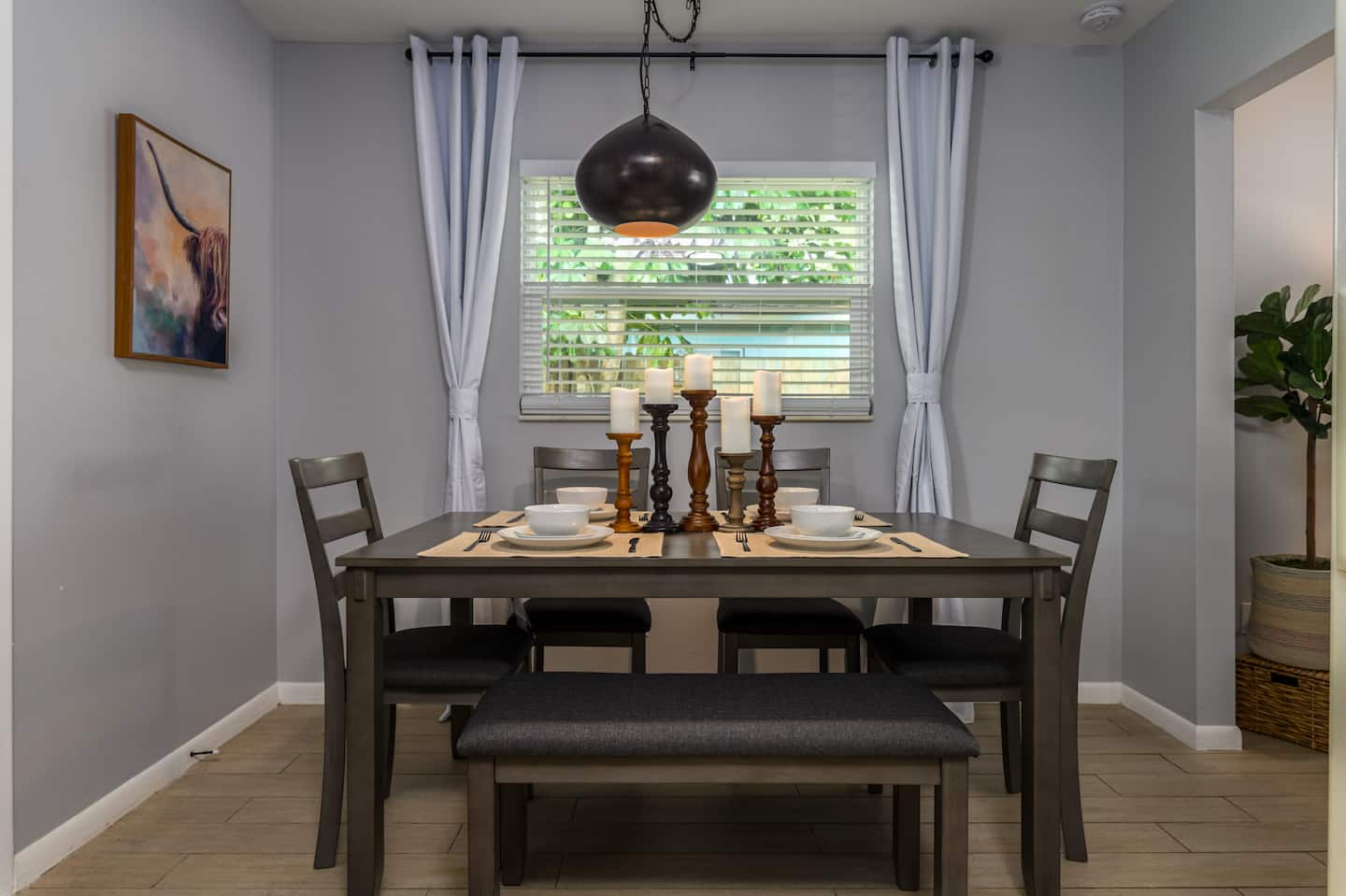 Our fully equipped kitchen invites you to prepare delicious meals with ease. Take advantage of the large fridge and freezer, stove and oven, microwave, toaster, pots, pans, cooking utensils, and full dining sets. Cleanup is a breeze with the dishwasher, and the dining room table offers seating for up to six guests. Enjoy your meals al fresco on the patio under the sun.
