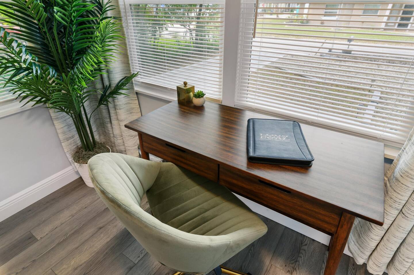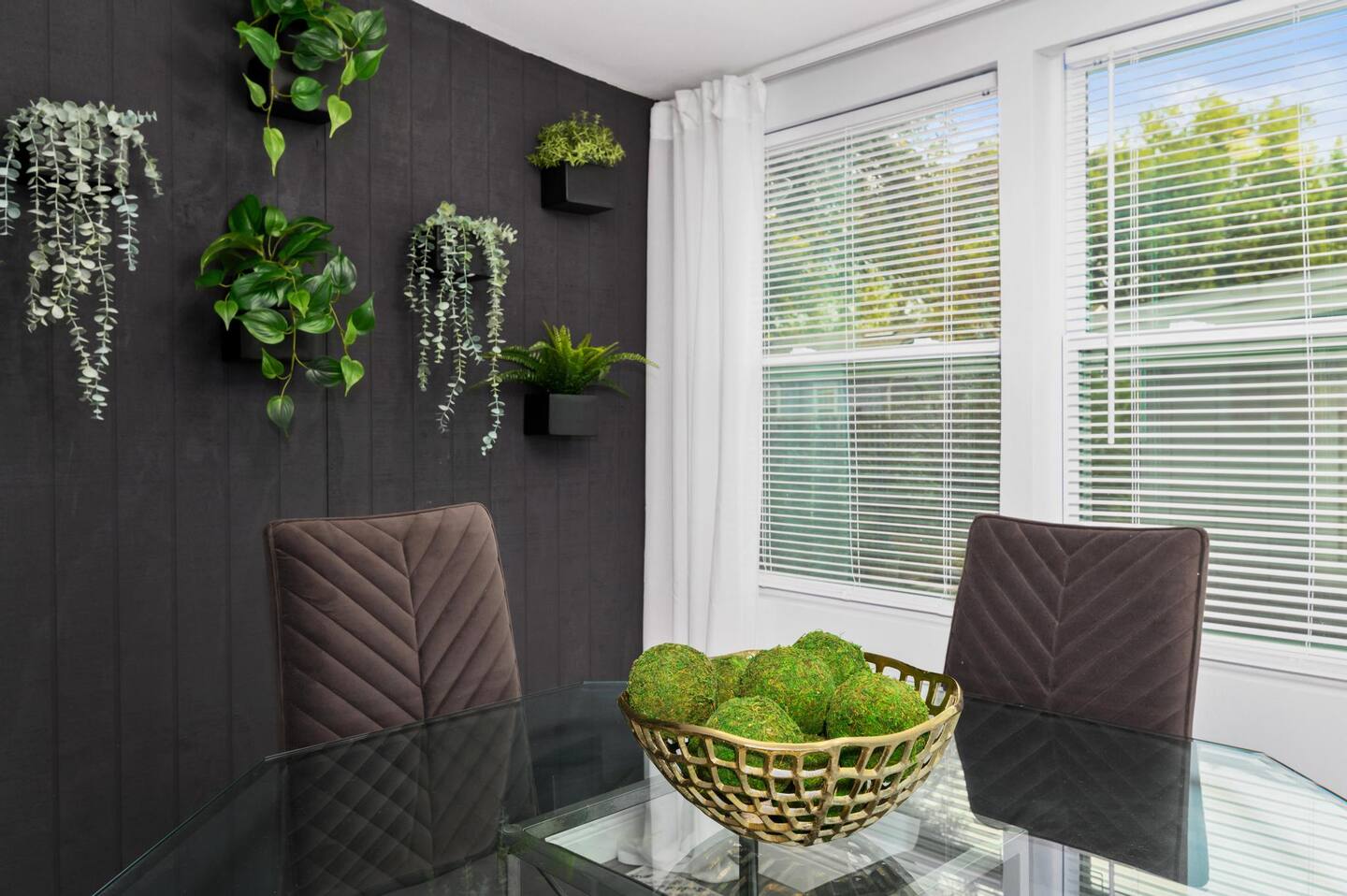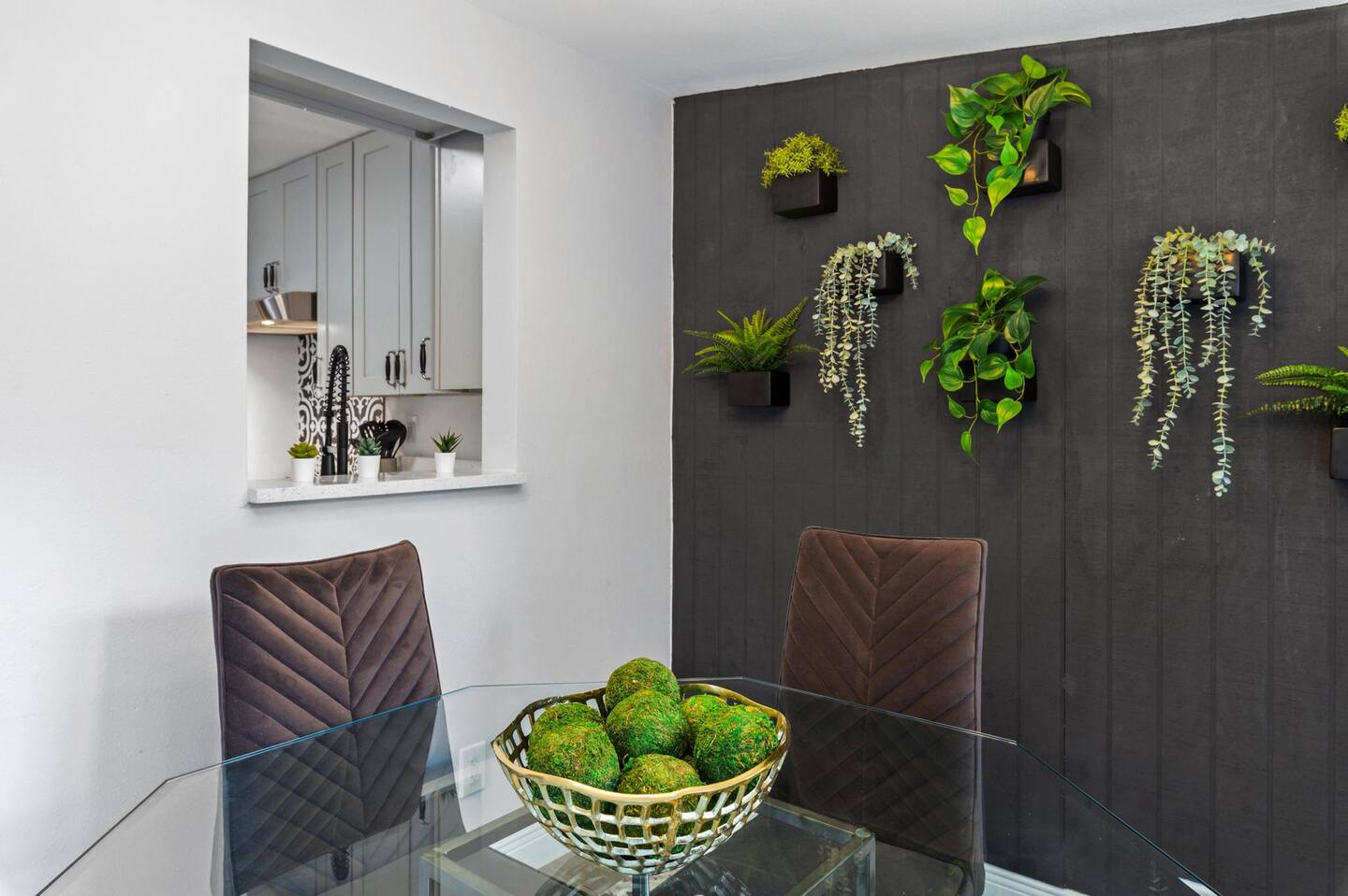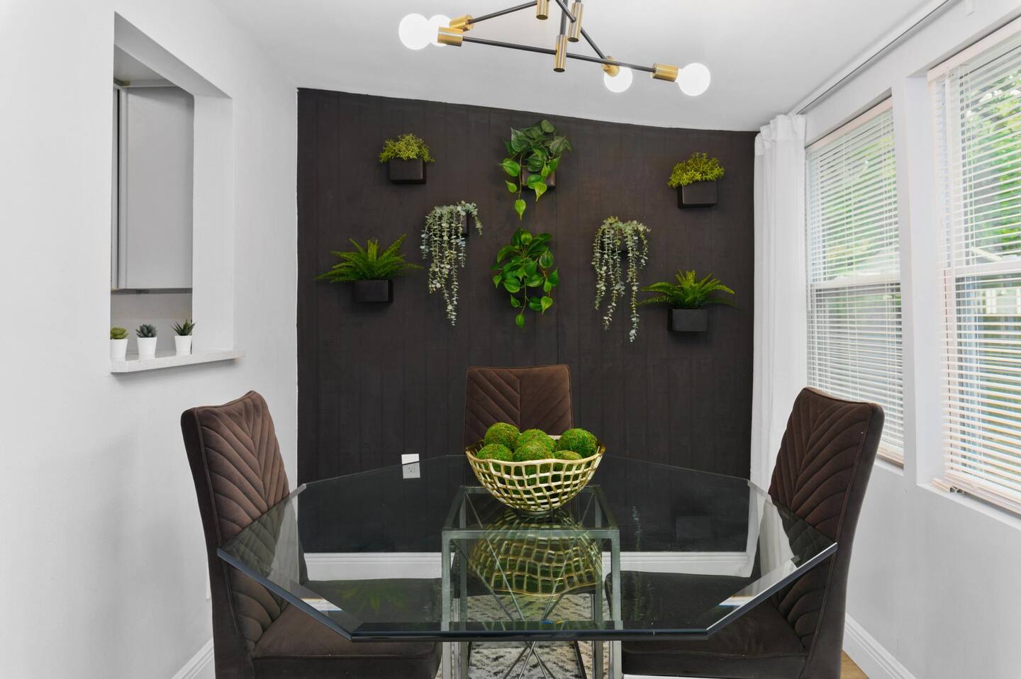 The dining area, a guest favorite, features a window wall, an open view to the kitchen, and a hanging plant wall—creating a refreshing ambiance for work or leisure.