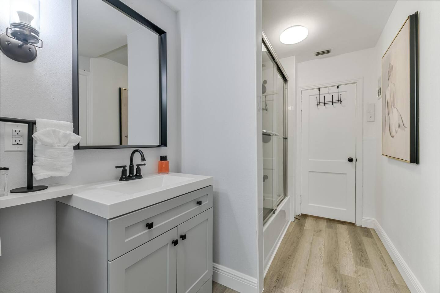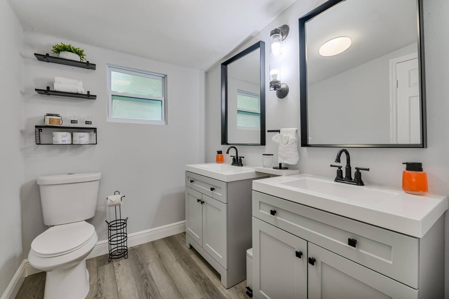 Our spacious bathroom boasts a double sink, toilet, large mirrors, and a newly tiled tub/shower combo, stocked with complimentary toiletries for your convenience.