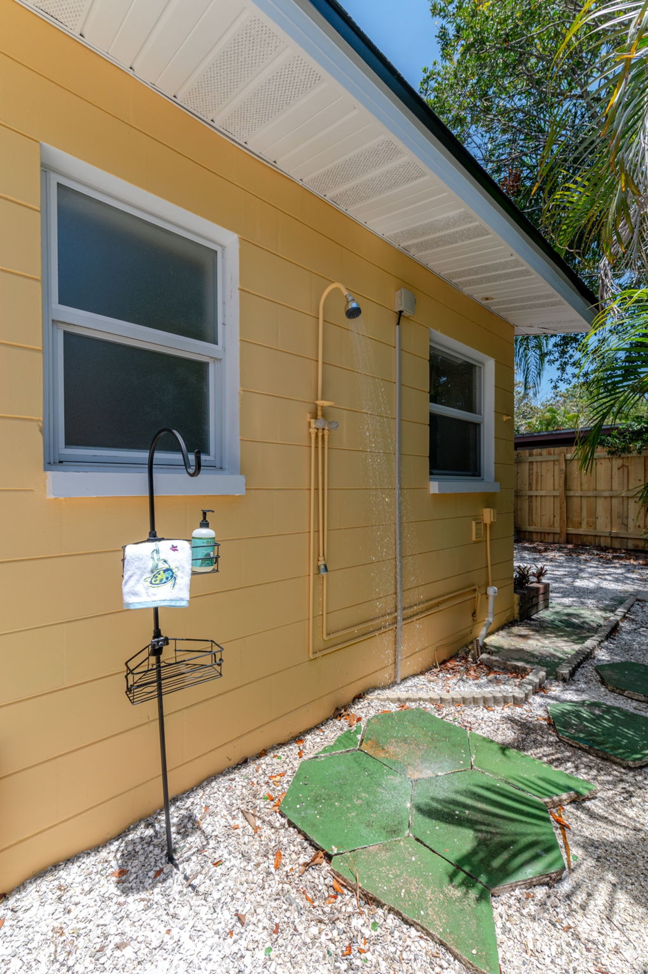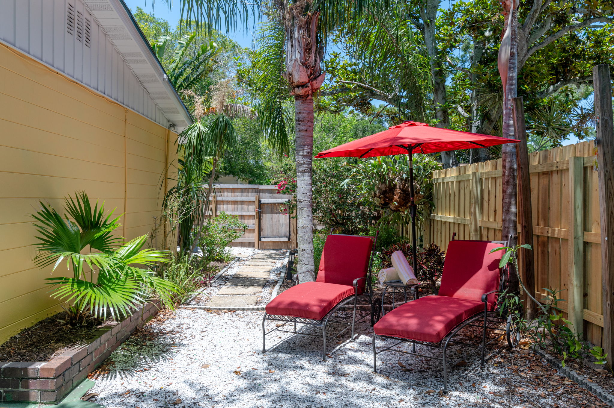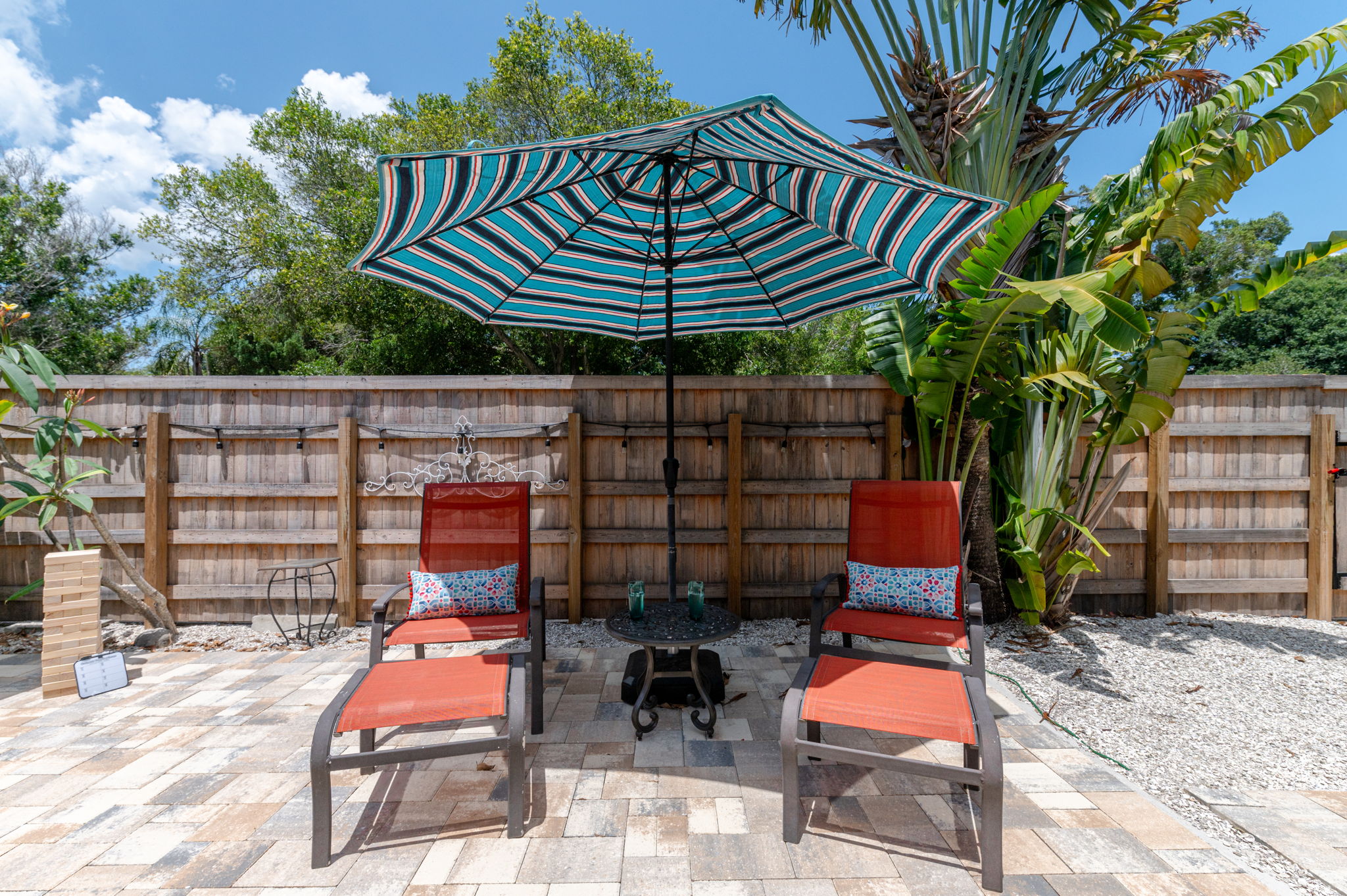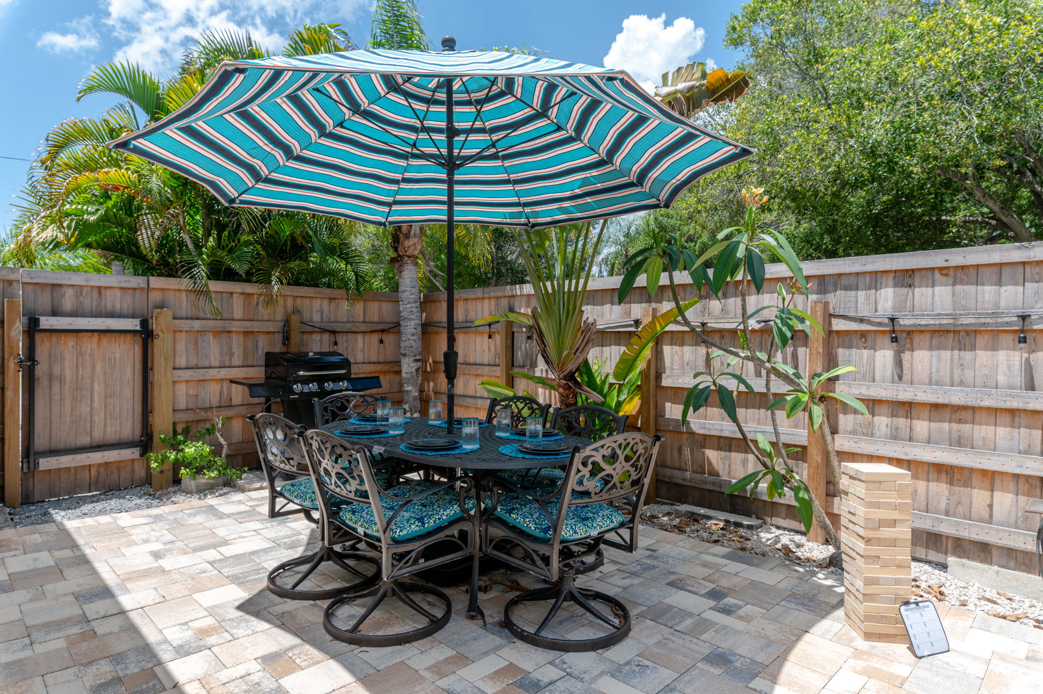 Step into your own little hideaway nestled in the backyard, where the sweet sounds of birds chirping fill the air. With its lush greenery and hints of old Florida charm, this spot is perfect for unwinding after a long day. Kick back and relax on comfy lounge chairs, where you can soak up the sunshine or cool off under the shade of a convenient umbrella. Fire up the grill and rustle up something tasty to enjoy while you soak in the relaxed vibes. And for some friendly fun, gather around the Jenga blocks and let the games begin.