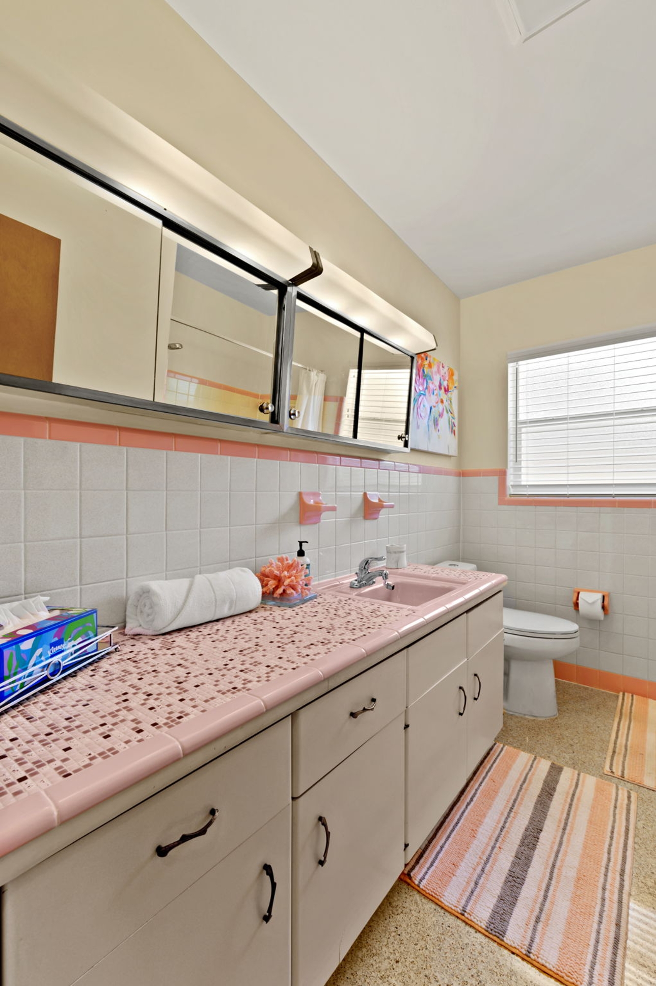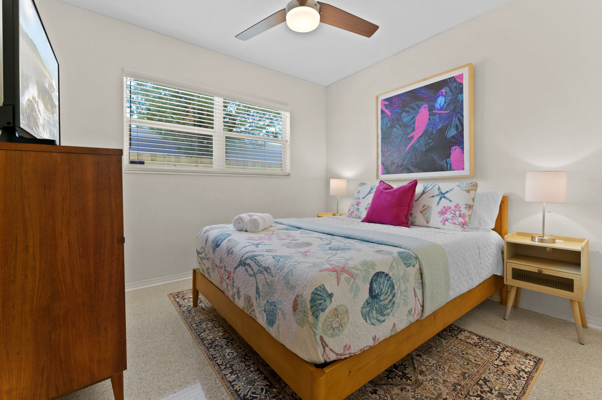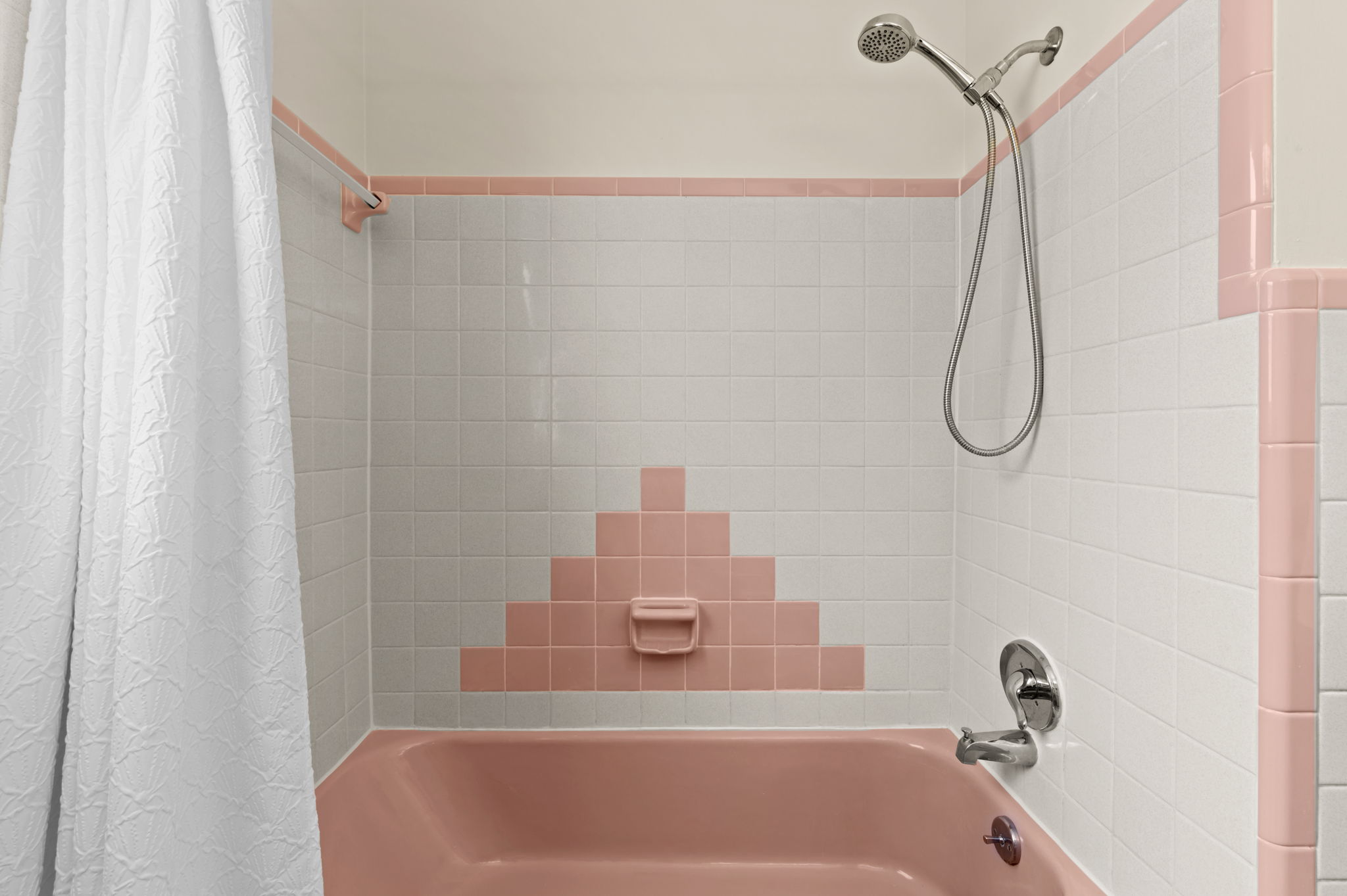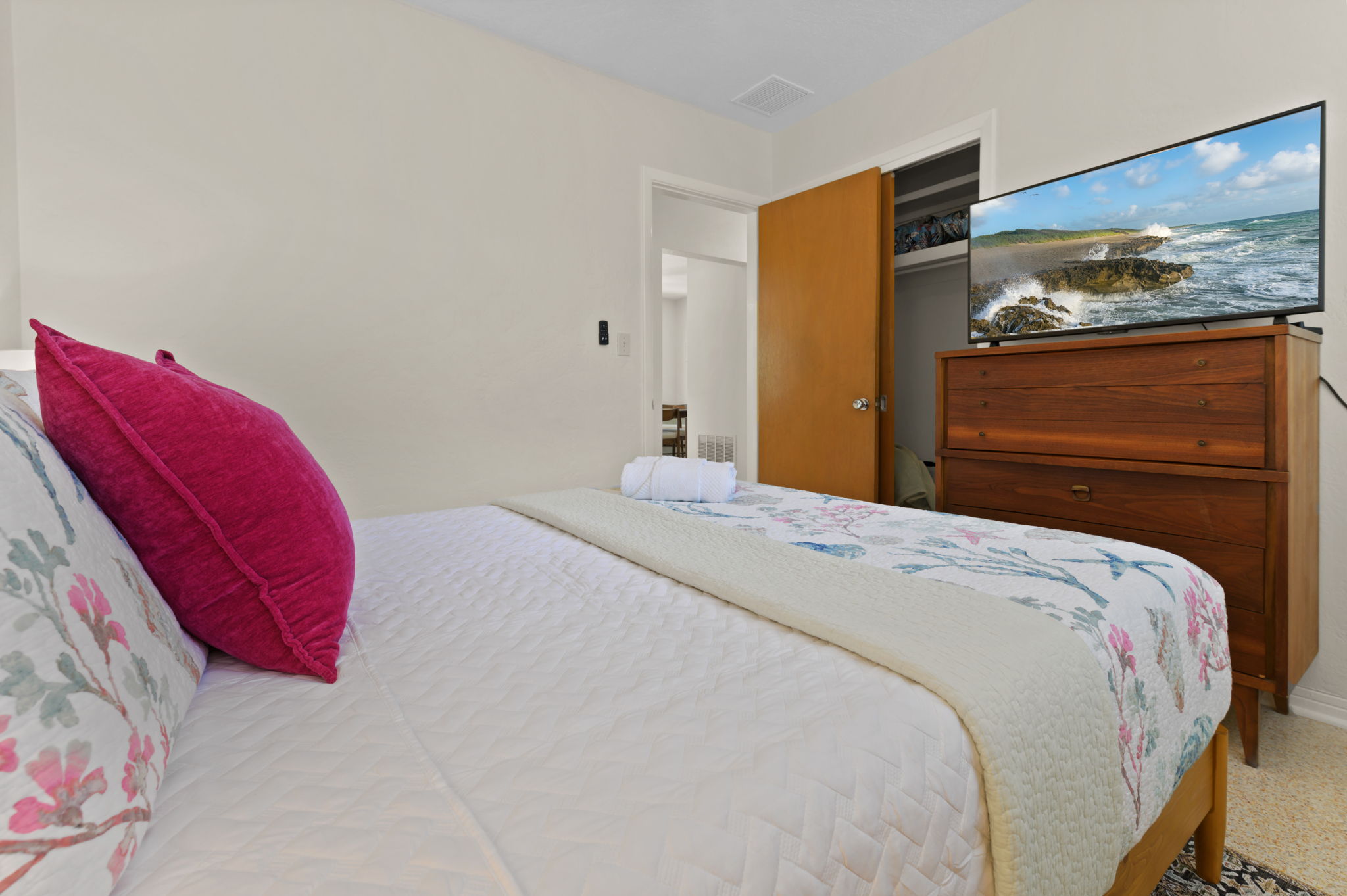 There are a total of 3 bedrooms, each nestled on the right side of the home. The primary offers a comfortable king bed with two dressers and a large closet, as well as a private en suite bathroom with a walk-in shower and brand-new vanity. Down the hall, you'll find two more bedrooms, another king bed, and the other with a queen. Both of these bedrooms offer ample drawer and closet space to store all of your personal items, and they share a charmingly preserved pink retro bathroom with a shower/tub combo. All of the bedrooms are equipped with a smart TV for endless entertainment.