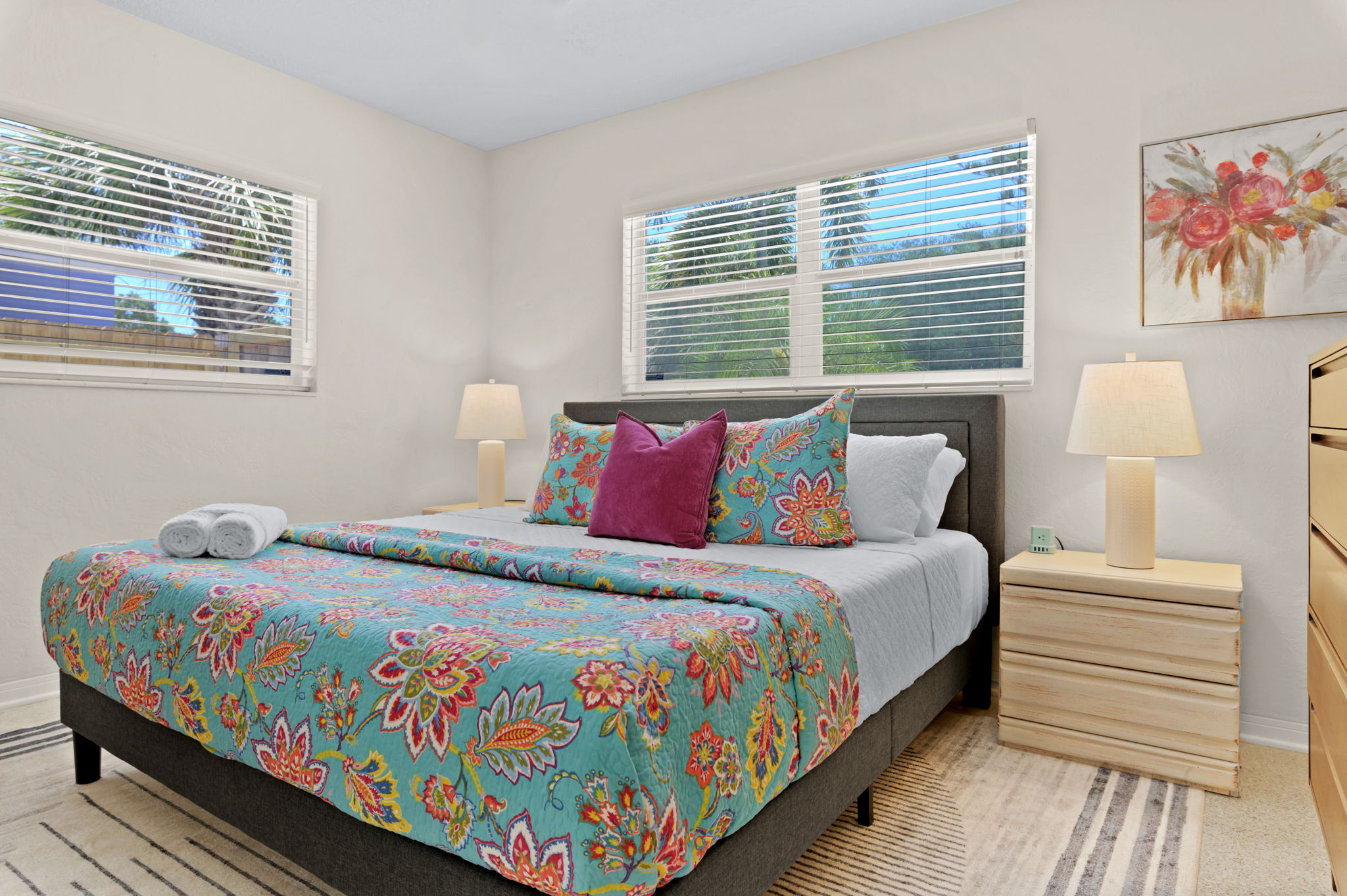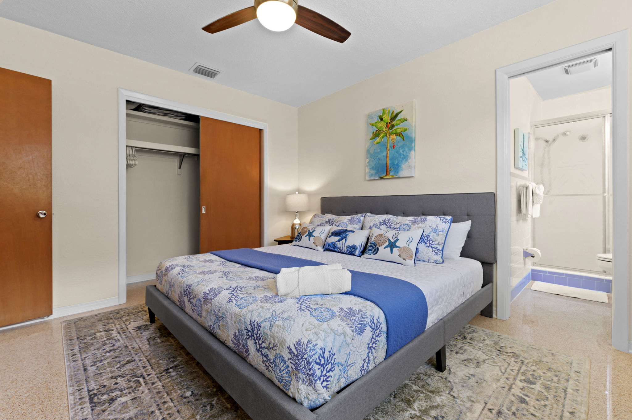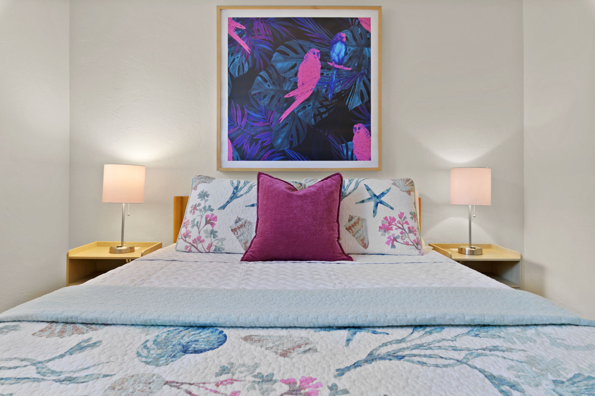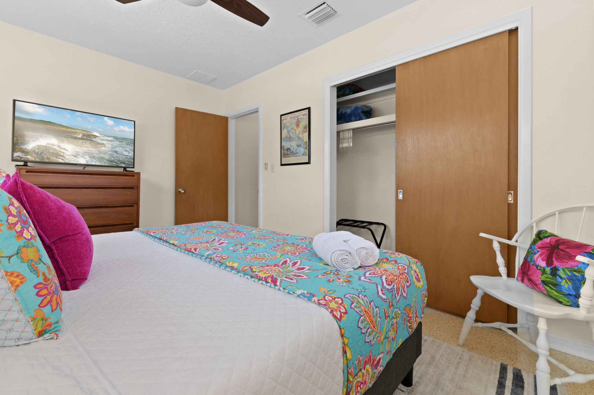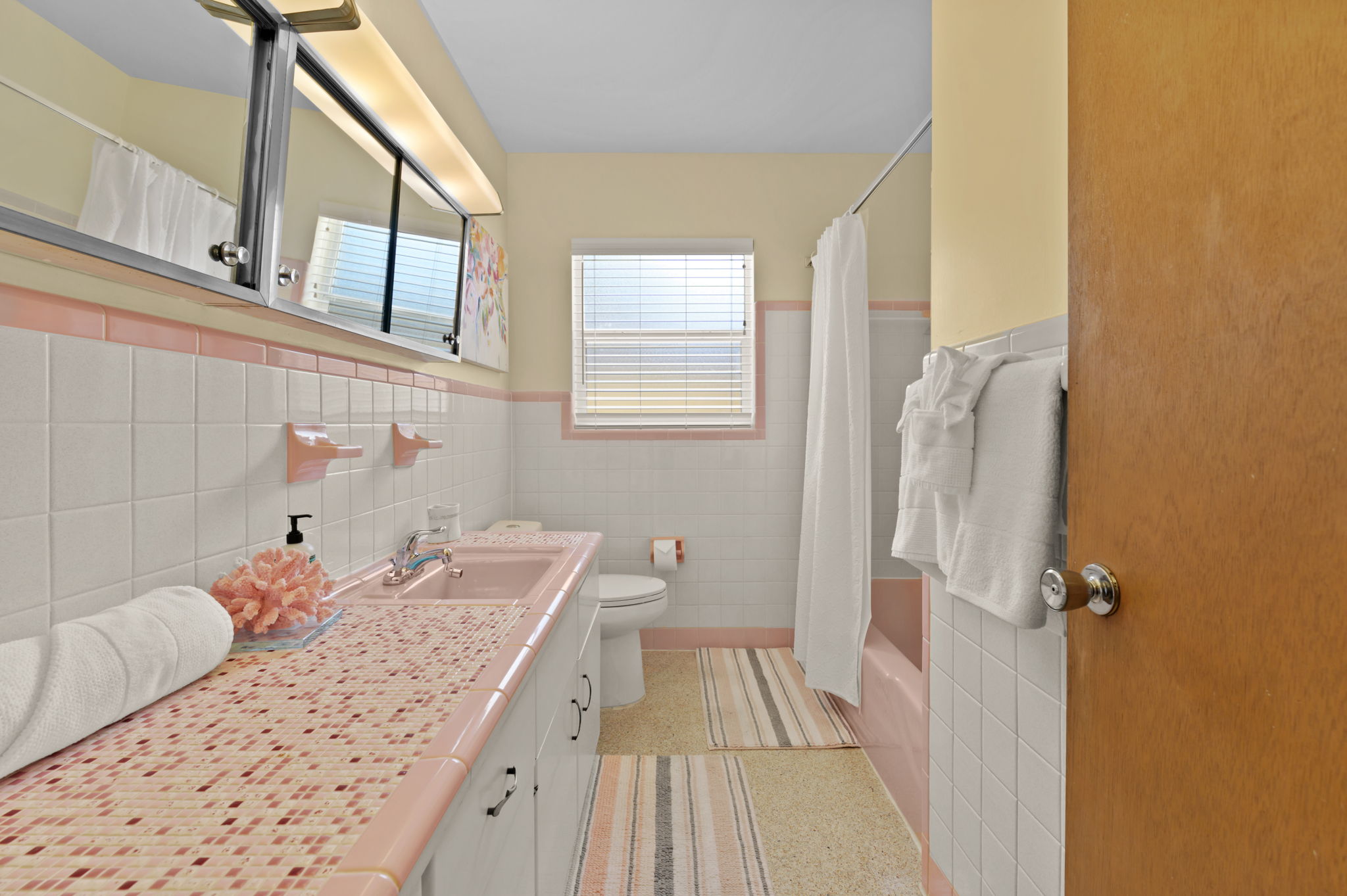 There are a total of 3 bedrooms, each nestled on the right side of the home. The primary offers a comfortable king bed with two dressers and a large closet, as well as a private en suite bathroom with a walk-in shower and brand-new vanity. Down the hall, you'll find two more bedrooms, another king bed, and the other with a queen. Both of these bedrooms offer ample drawer and closet space to store all of your personal items, and they share a charmingly preserved pink retro bathroom with a shower/tub combo. All of the bedrooms are equipped with a smart TV for endless entertainment.