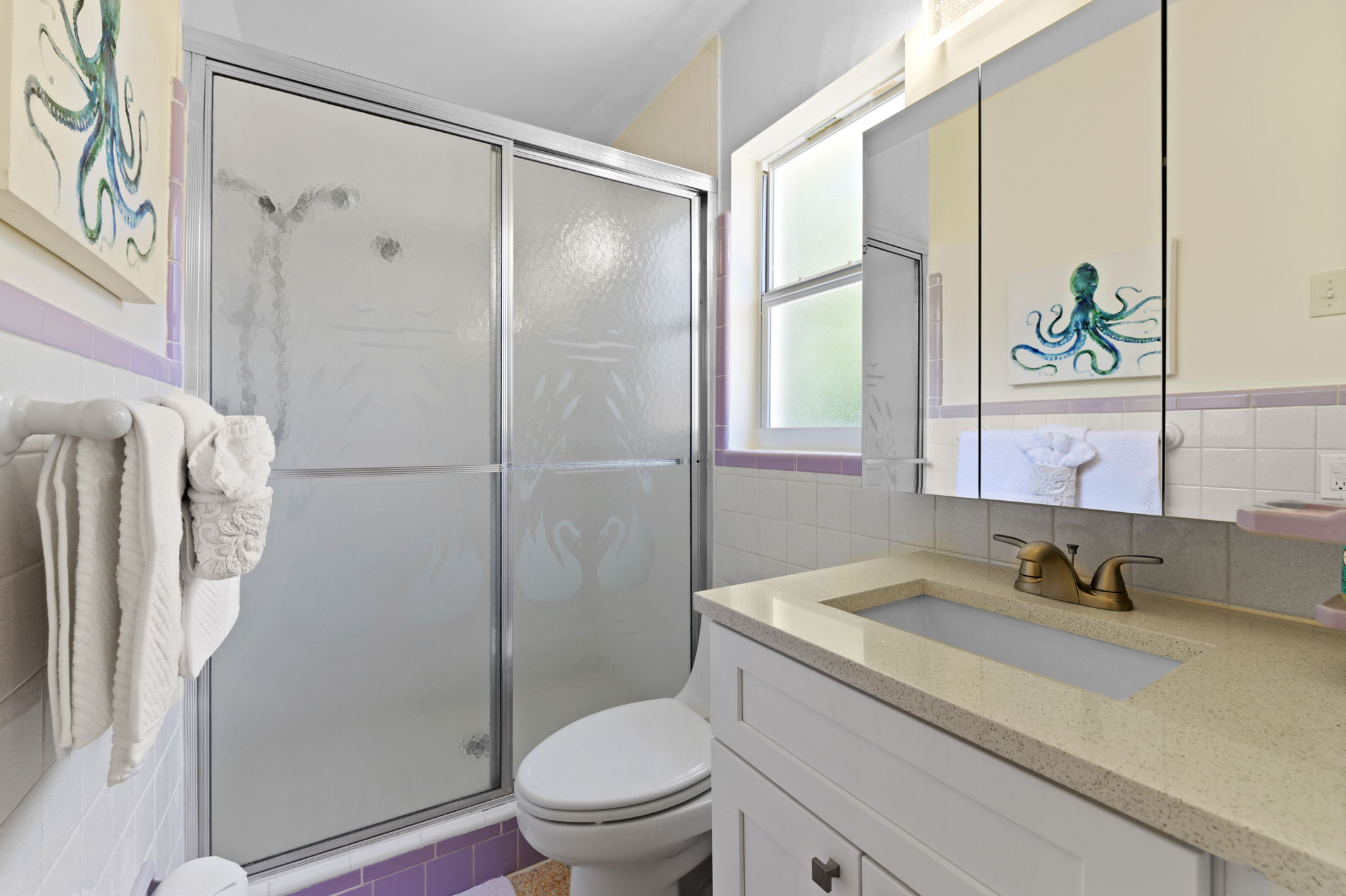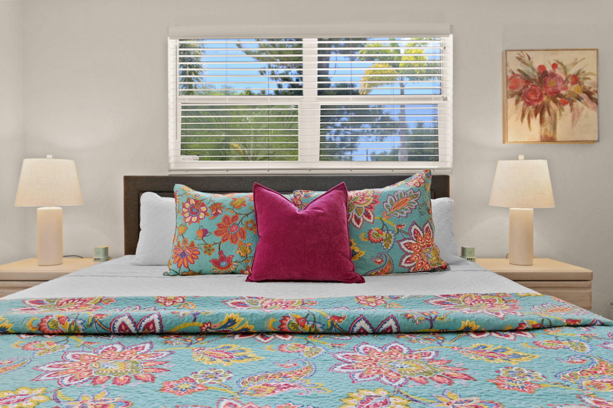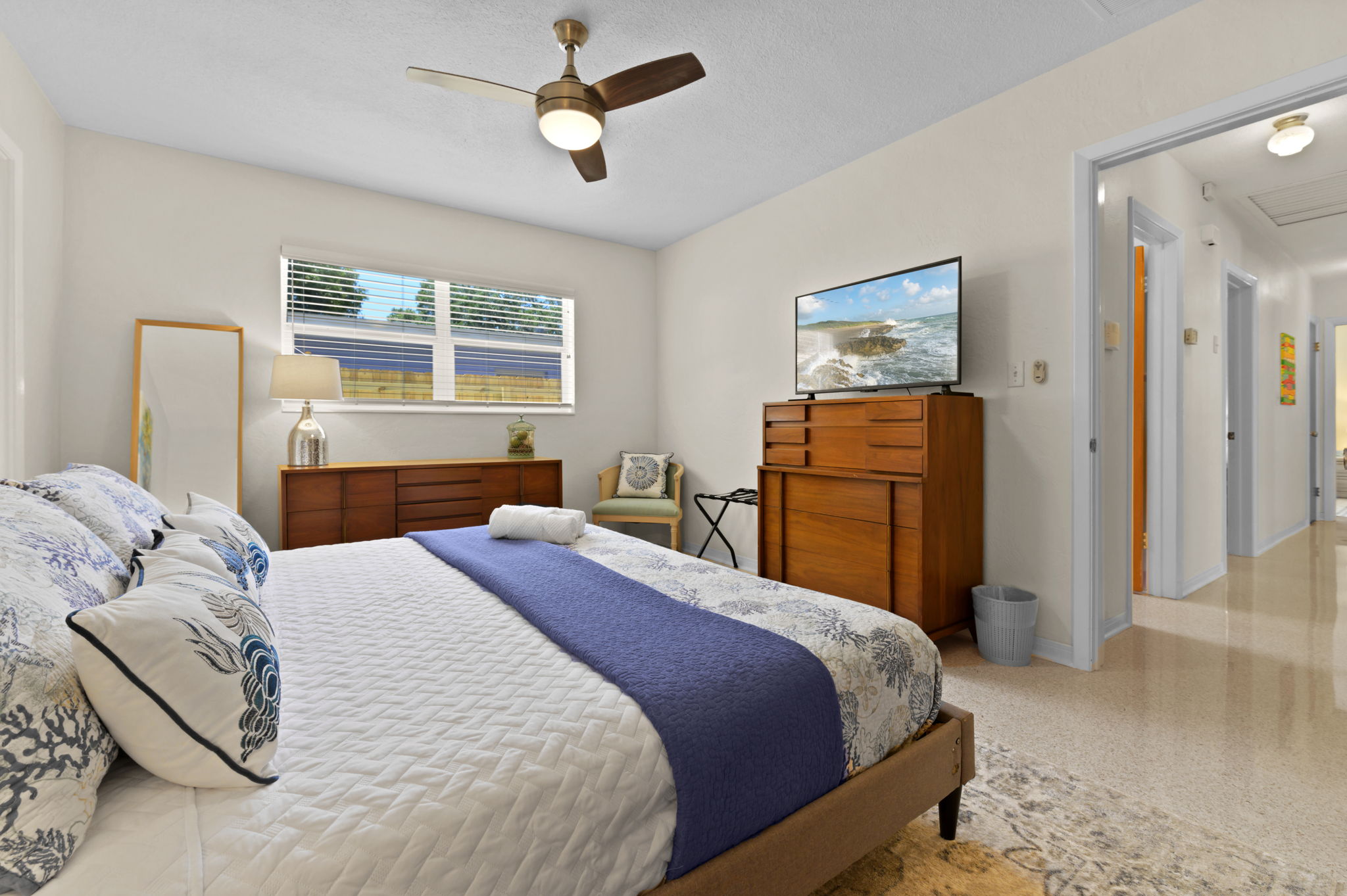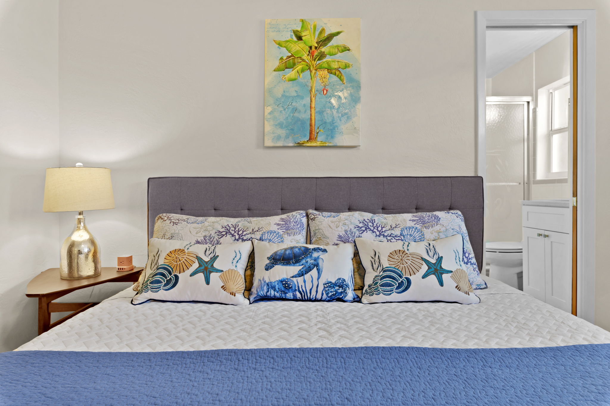 There are a total of 3 bedrooms, each nestled on the right side of the home. The primary offers a comfortable king bed with two dressers and a large closet, as well as a private en suite bathroom with a walk-in shower and brand-new vanity. Down the hall, you'll find two more bedrooms, another king bed, and the other with a queen. Both of these bedrooms offer ample drawer and closet space to store all of your personal items, and they share a charmingly preserved pink retro bathroom with a shower/tub combo. All of the bedrooms are equipped with a smart TV for endless entertainment.