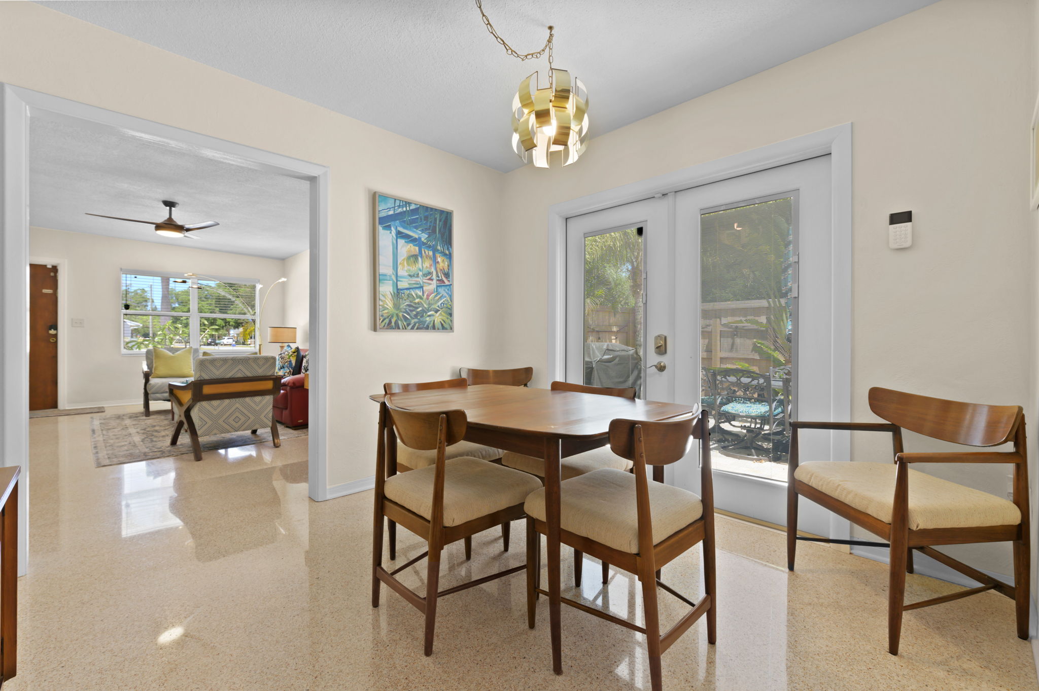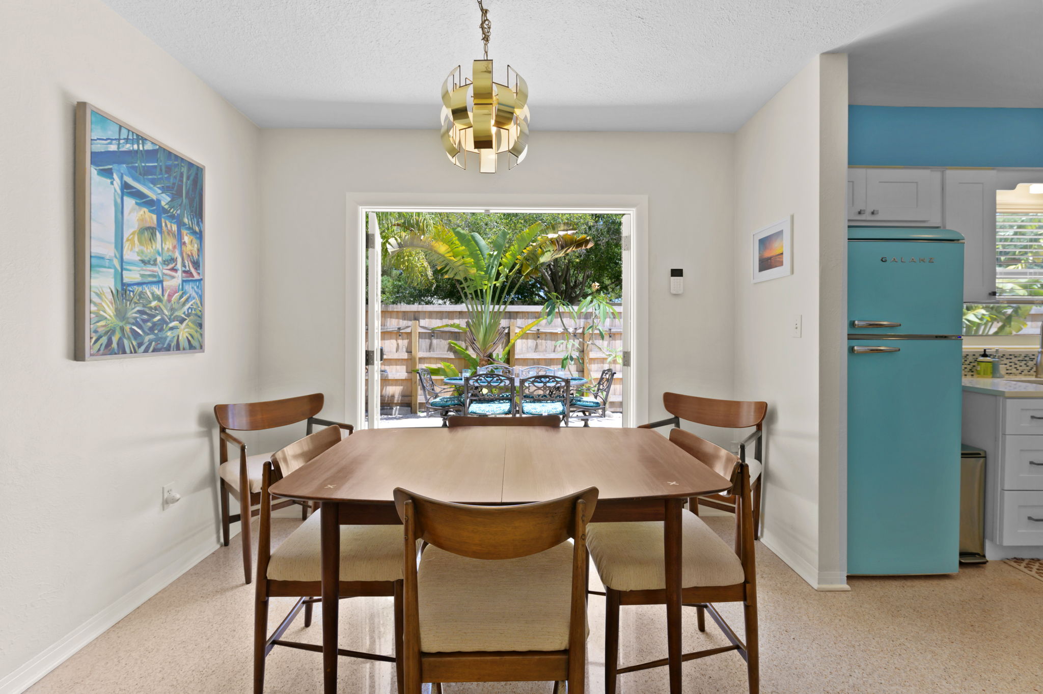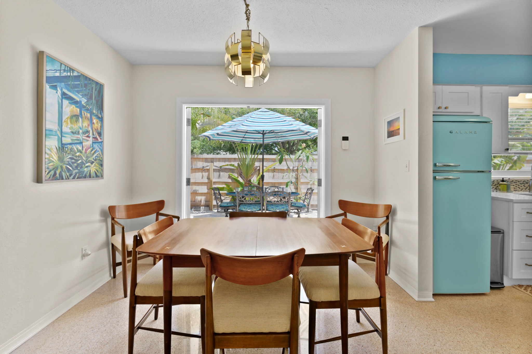 Adjacent to the kitchen sits a cozy dinette, accommodating up to six guests. French doors lead to a peaceful outdoor patio surrounded by lush greenery, complete with a gas grill and an additional dining table shaded by an umbrella, perfect for enjoying al fresco meals both day and night.