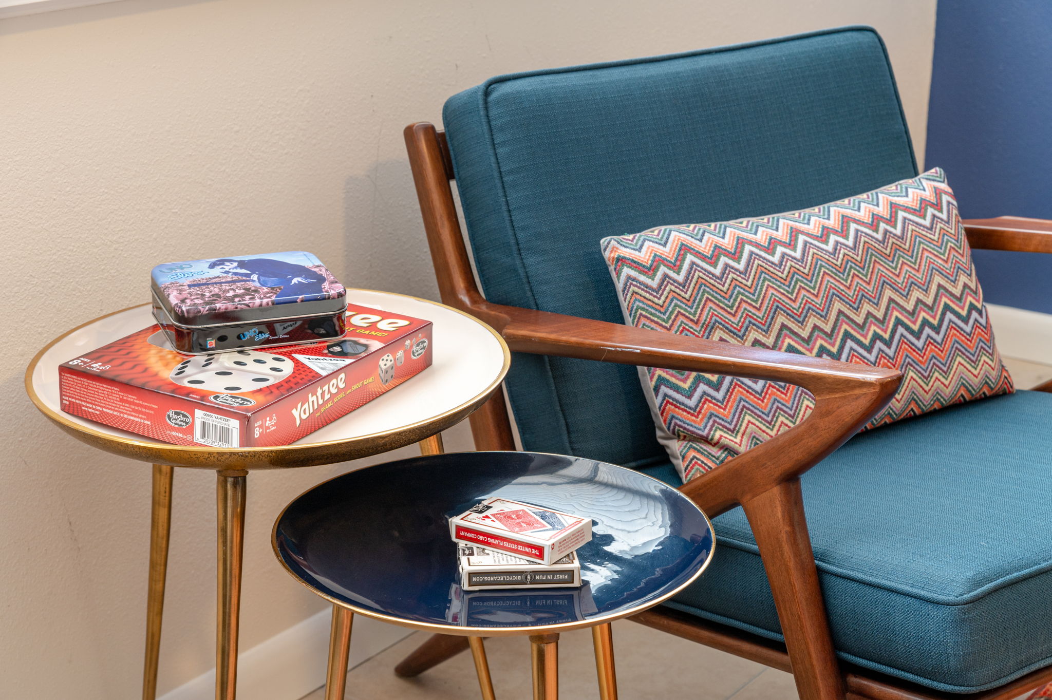 The 1960s-style kitchen offers many classic characteristics including a delightful blue color scheme, a rounded edge breakfast bar supported by funky rod iron A-frame legs, and a retro-style refrigerator to truly tie into the vintage vibe of the '60s. We've made sure to include all of the household kitchen items you'd expect to be able to cook up wonderful meals throughout your stay including pots/pans, a variety of crockery, a blender, various cooking utensils, a deep sink, and stainless steel appliances, including a dishwasher for easy clean-ups!