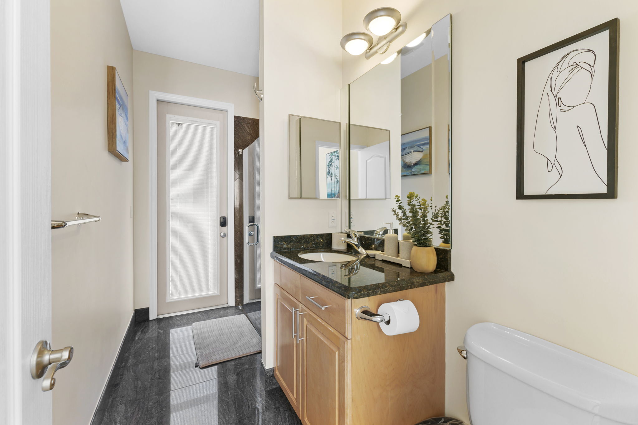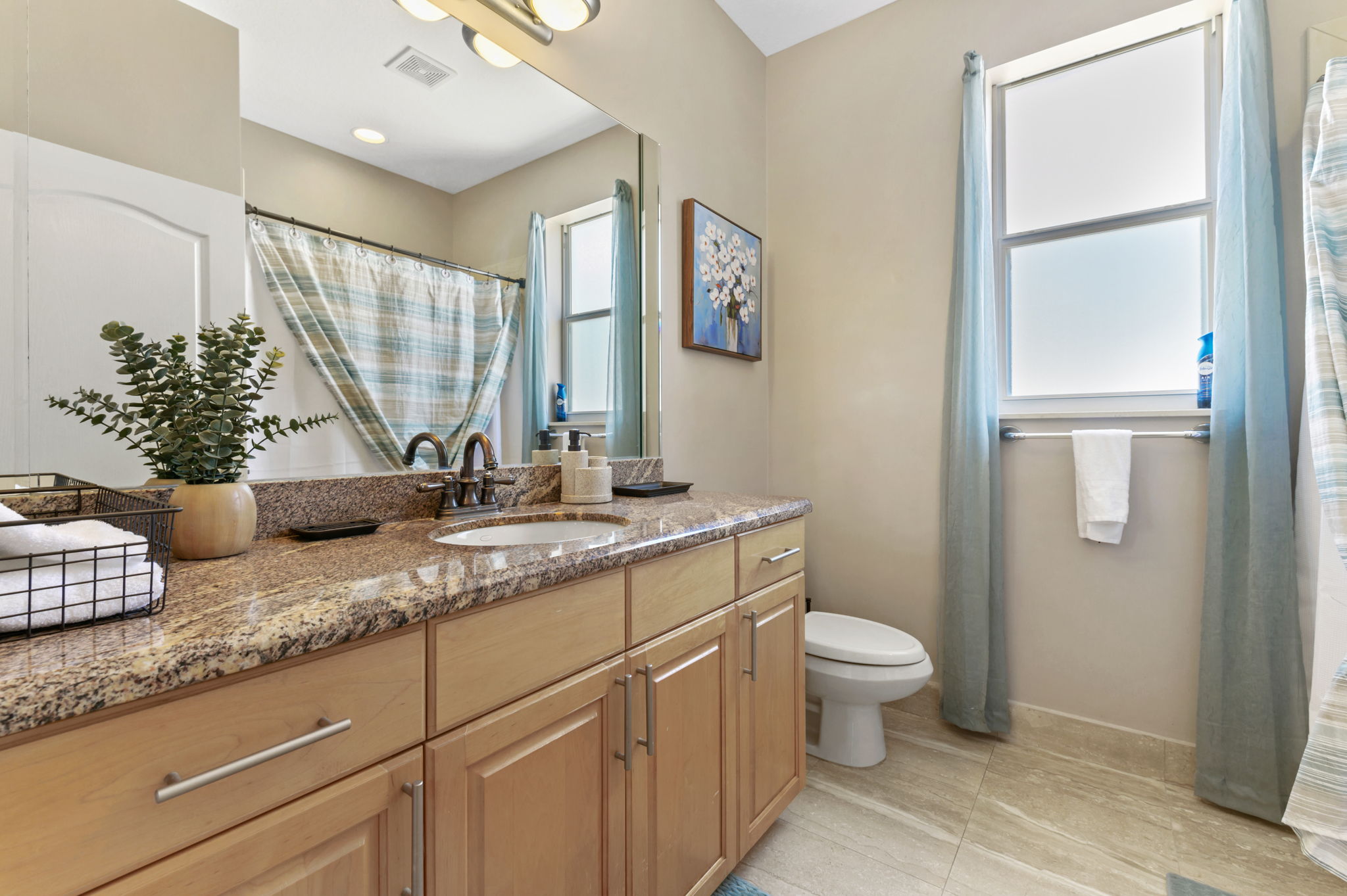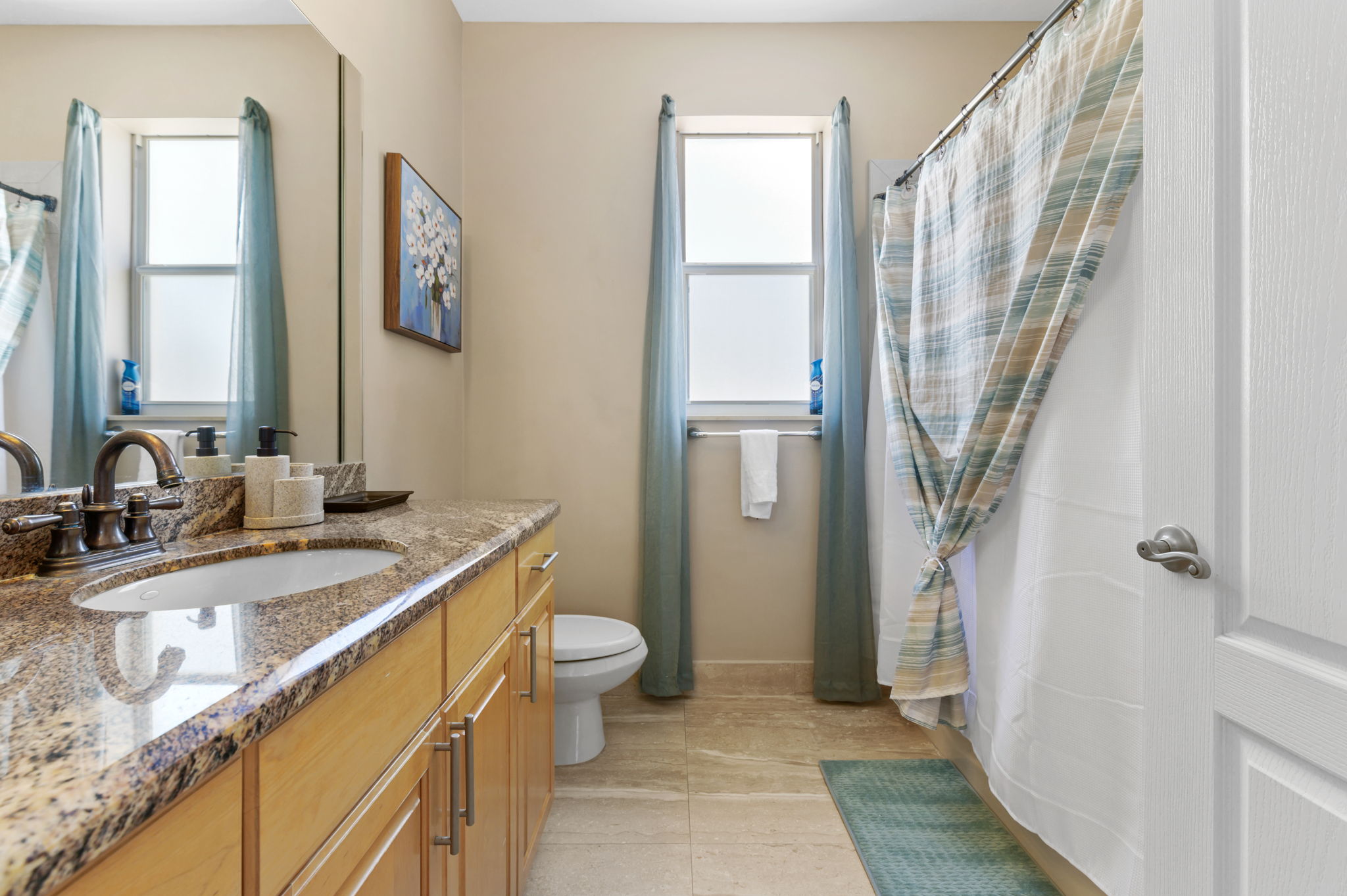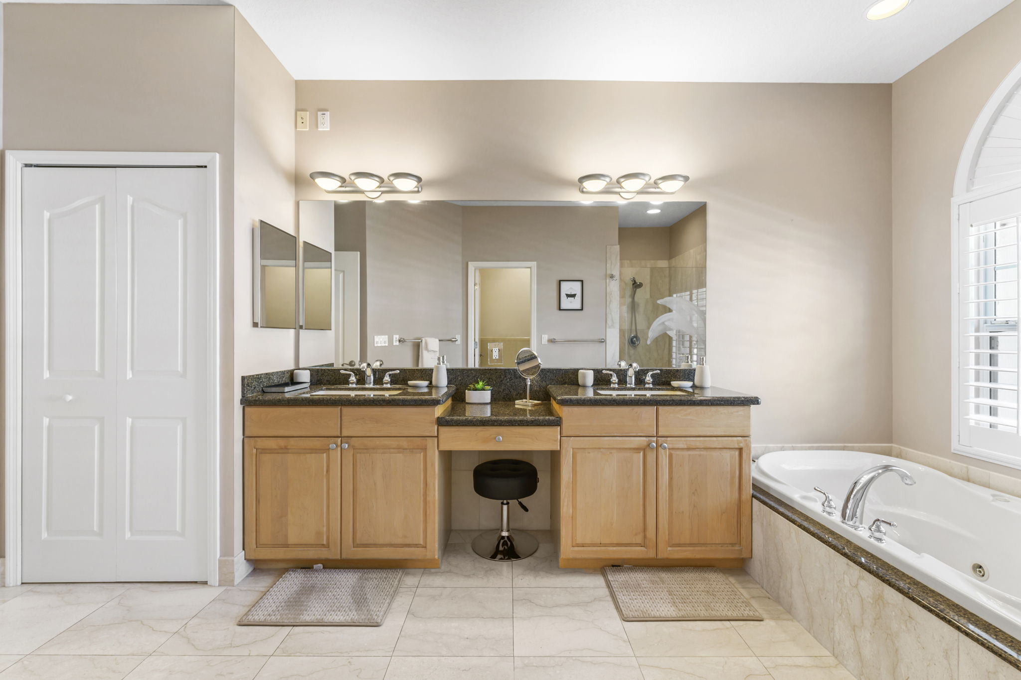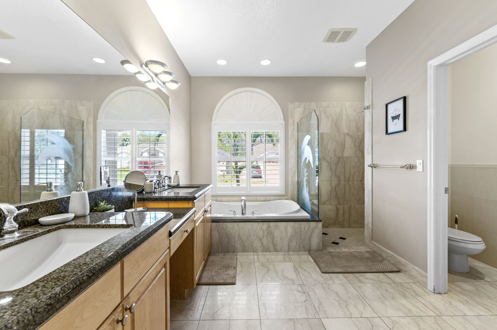 Prepare to unwind in the luxurious bathrooms of this exquisite vacation rental home, where every detail is designed for your comfort and convenience. The primary bathroom features dual vanity sinks, a marble walk-in shower, and a luxurious Jacuzzi bathtub, offering the epitome of relaxation.