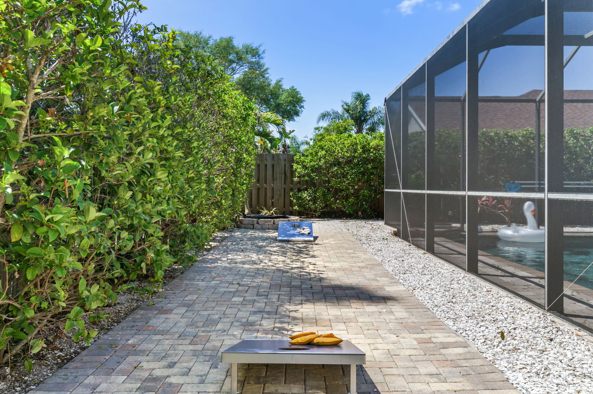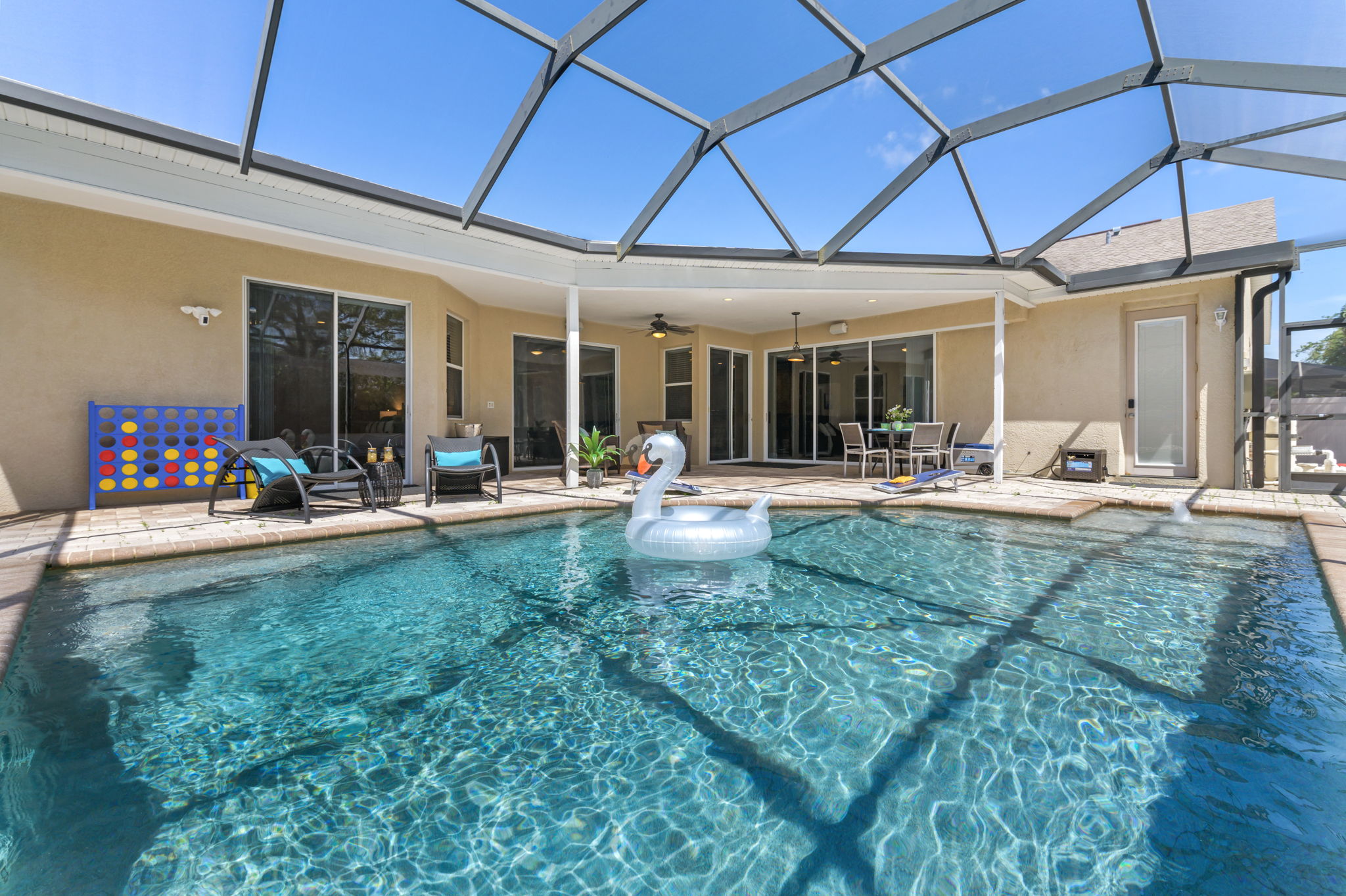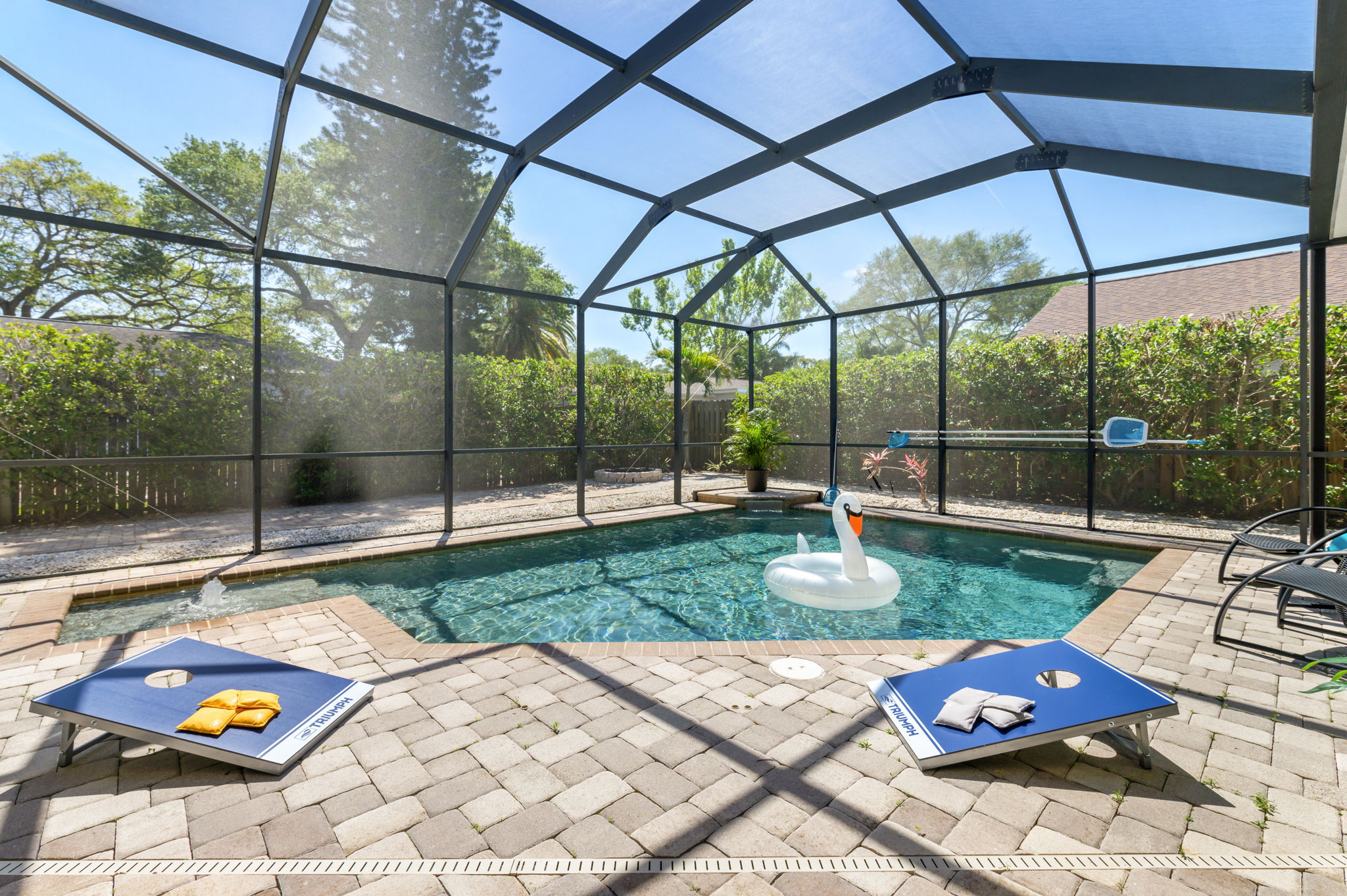 Additional amenities such as corn hole and pool noodles ensure endless entertainment options for family and friends. Whether seeking relaxation or excitement, this outdoor haven offers the perfect backdrop for creating cherished memories with loved ones.