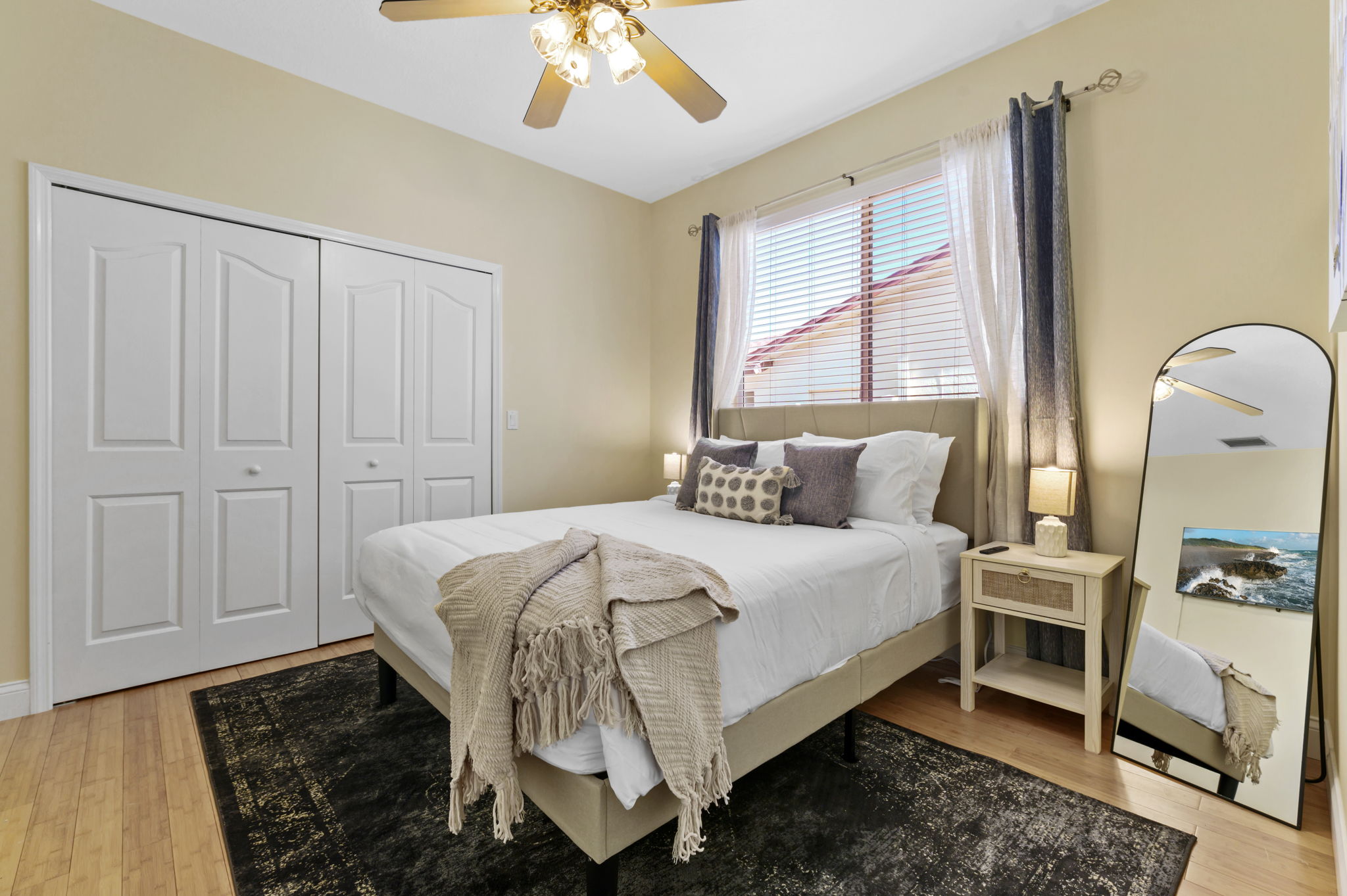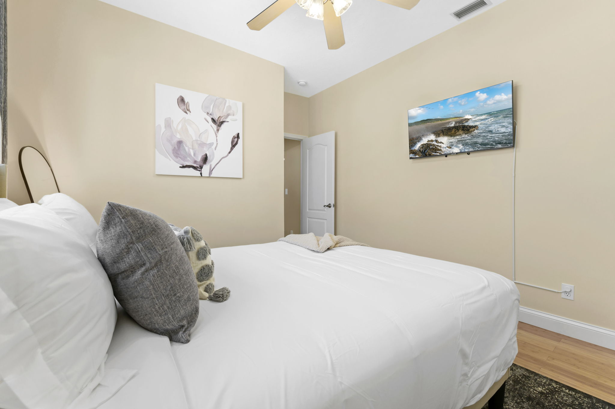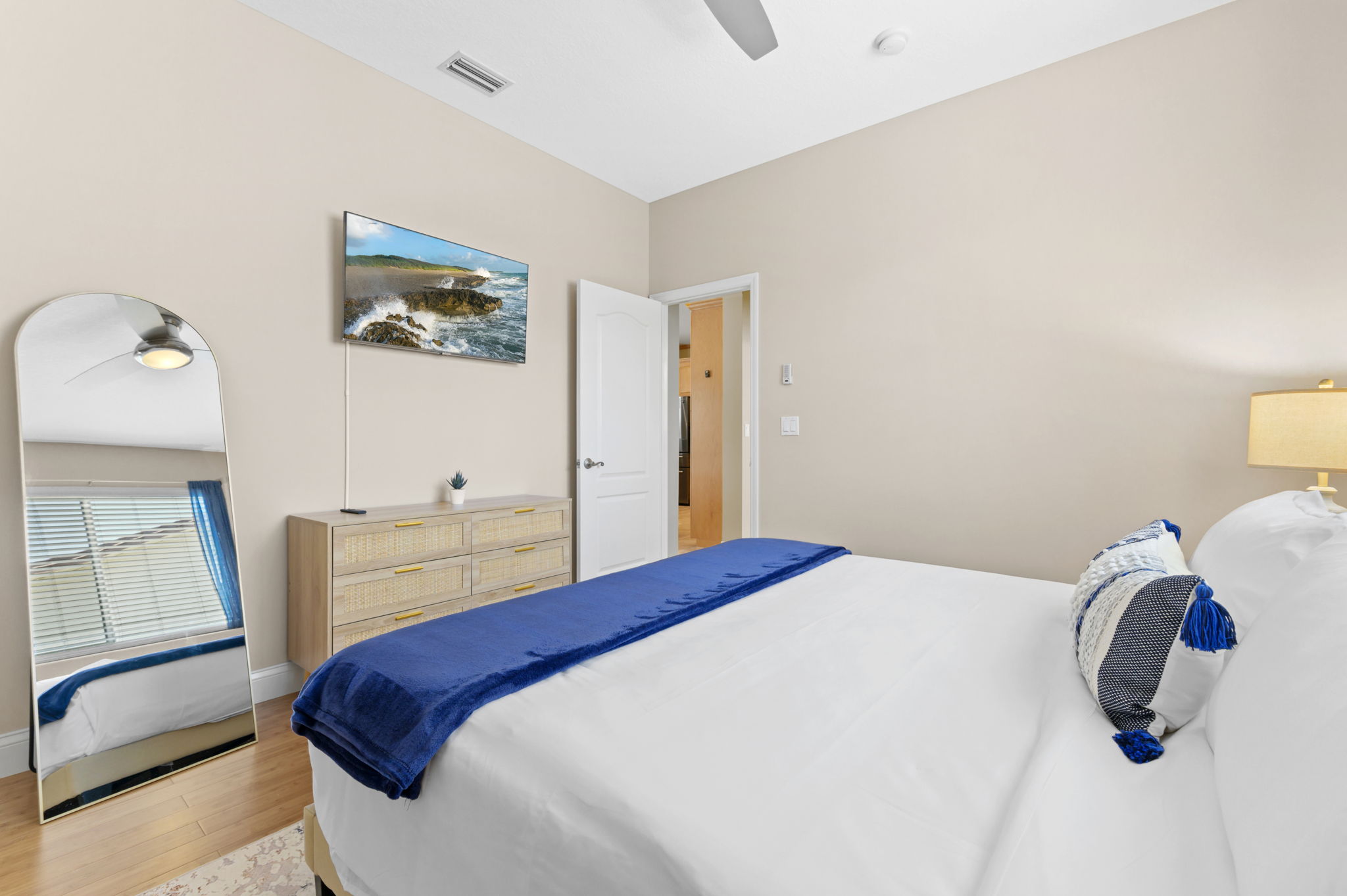 On the other side of the home, three additional bedrooms offer cozy retreats for guests. Guest bedroom #1 offers another king bed suite with a smart TV, full length mirror, closet, drawers, and nightstands with touch lamps for added convenience. The 2nd guest bedroom offers a queen bed and provides a serene escape, complete with a closet, smart TV, and elegant furnishings.