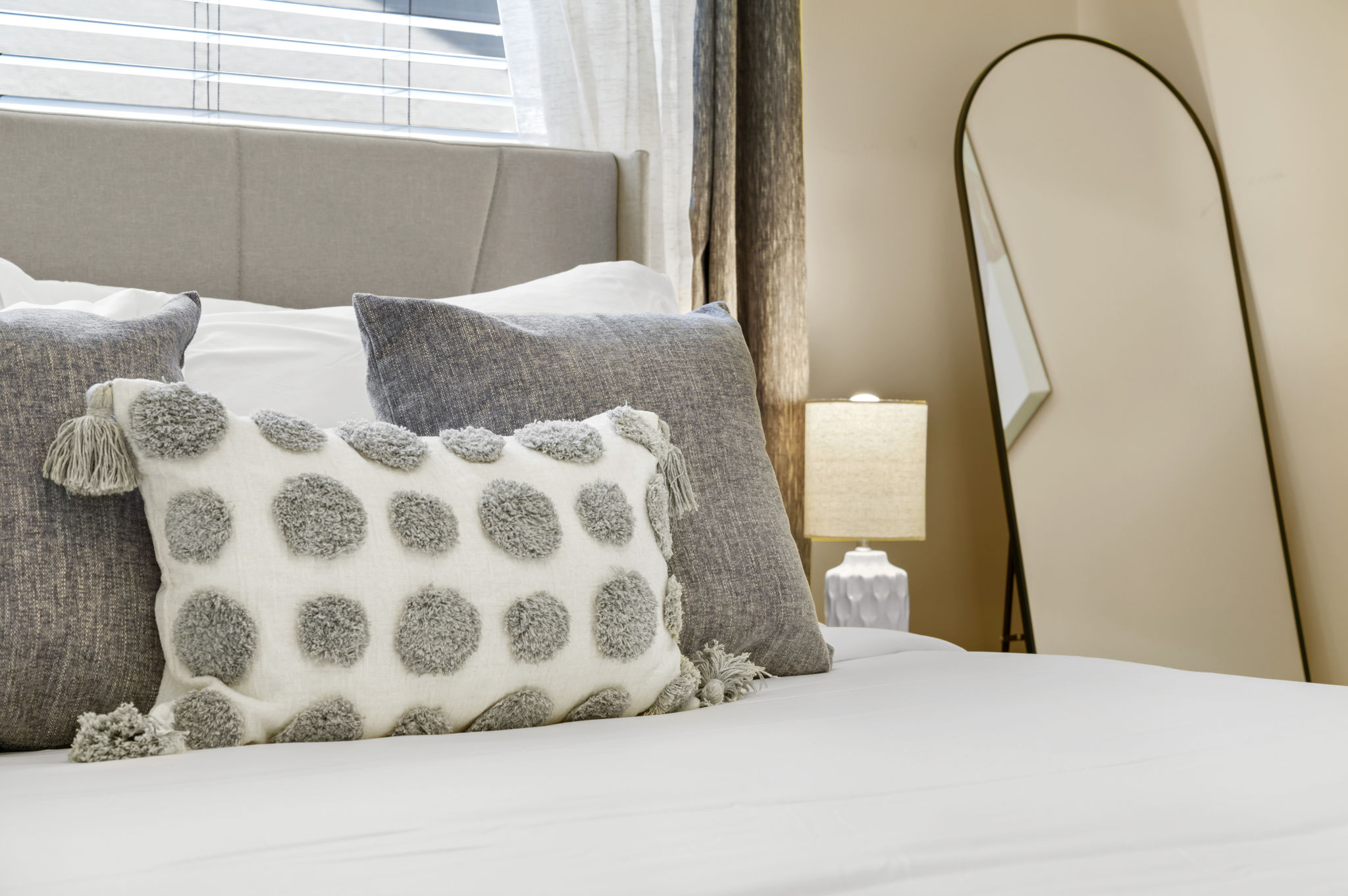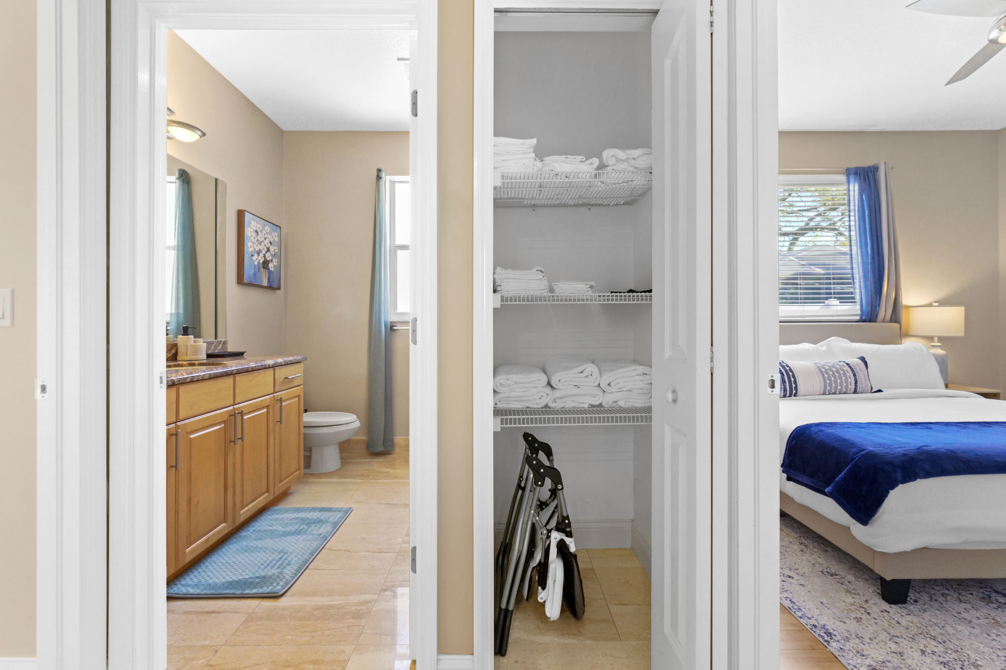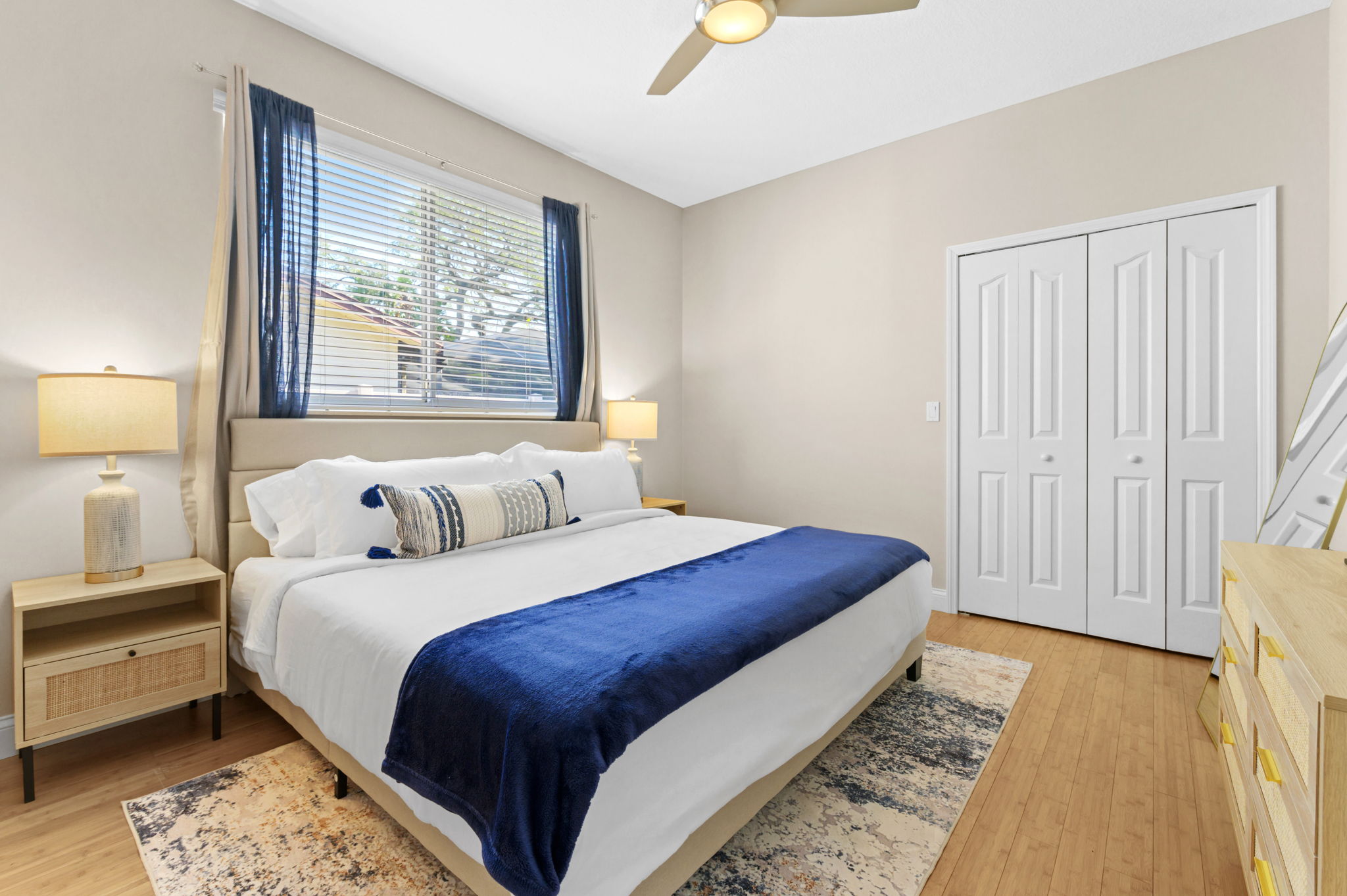 On the other side of the home, three additional bedrooms offer cozy retreats for guests. Guest bedroom #1 offers another king bed suite with a smart TV, full length mirror, closet, drawers, and nightstands with touch lamps for added convenience. The 2nd guest bedroom offers a queen bed and provides a serene escape, complete with a closet, smart TV, and elegant furnishings.