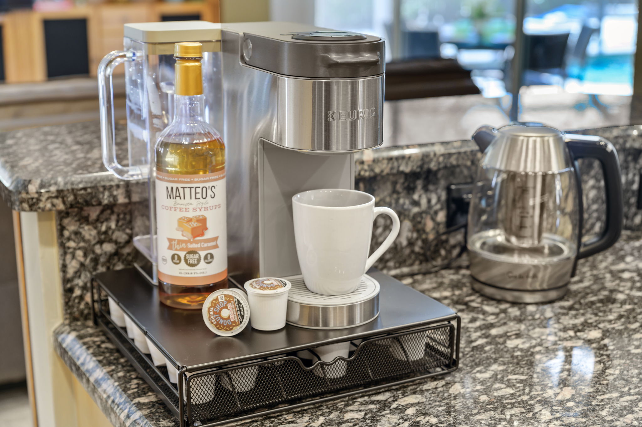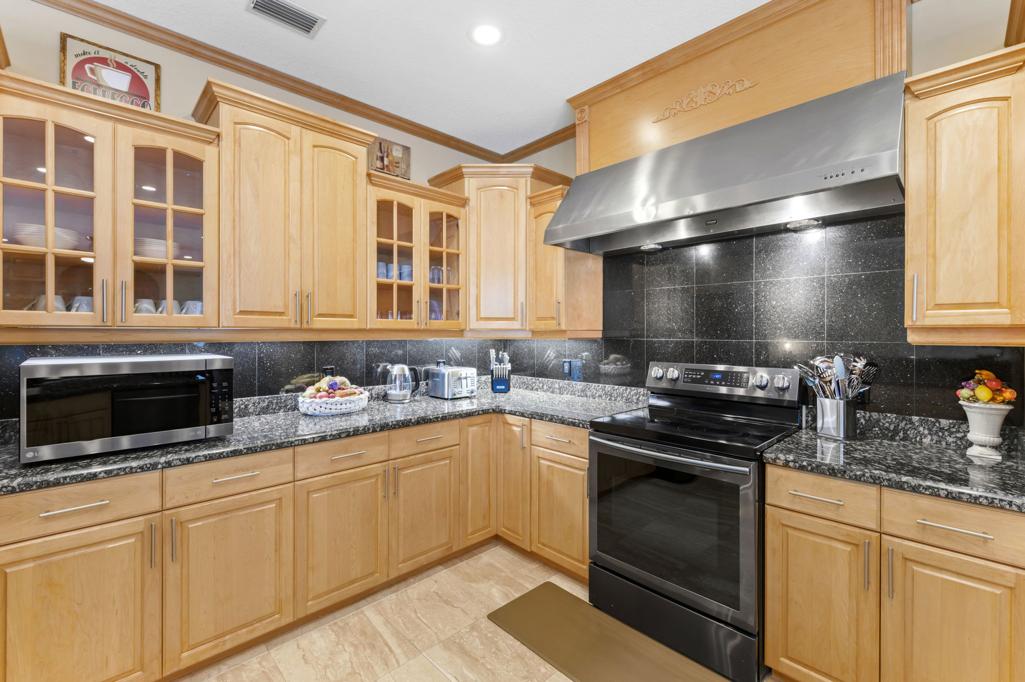 Step into culinary luxury within the well-appointed kitchen. Sturdy hardwood cabinets, sleek granite countertops, and a commercial-style Venmar range hood with heat lamps define this space. Abundant storage ensures organization, while traditional decor adds charm. Bar stools provide seating for casual dining, while a cozy nook overlooks the pool area, accommodating up to four guests comfortably.