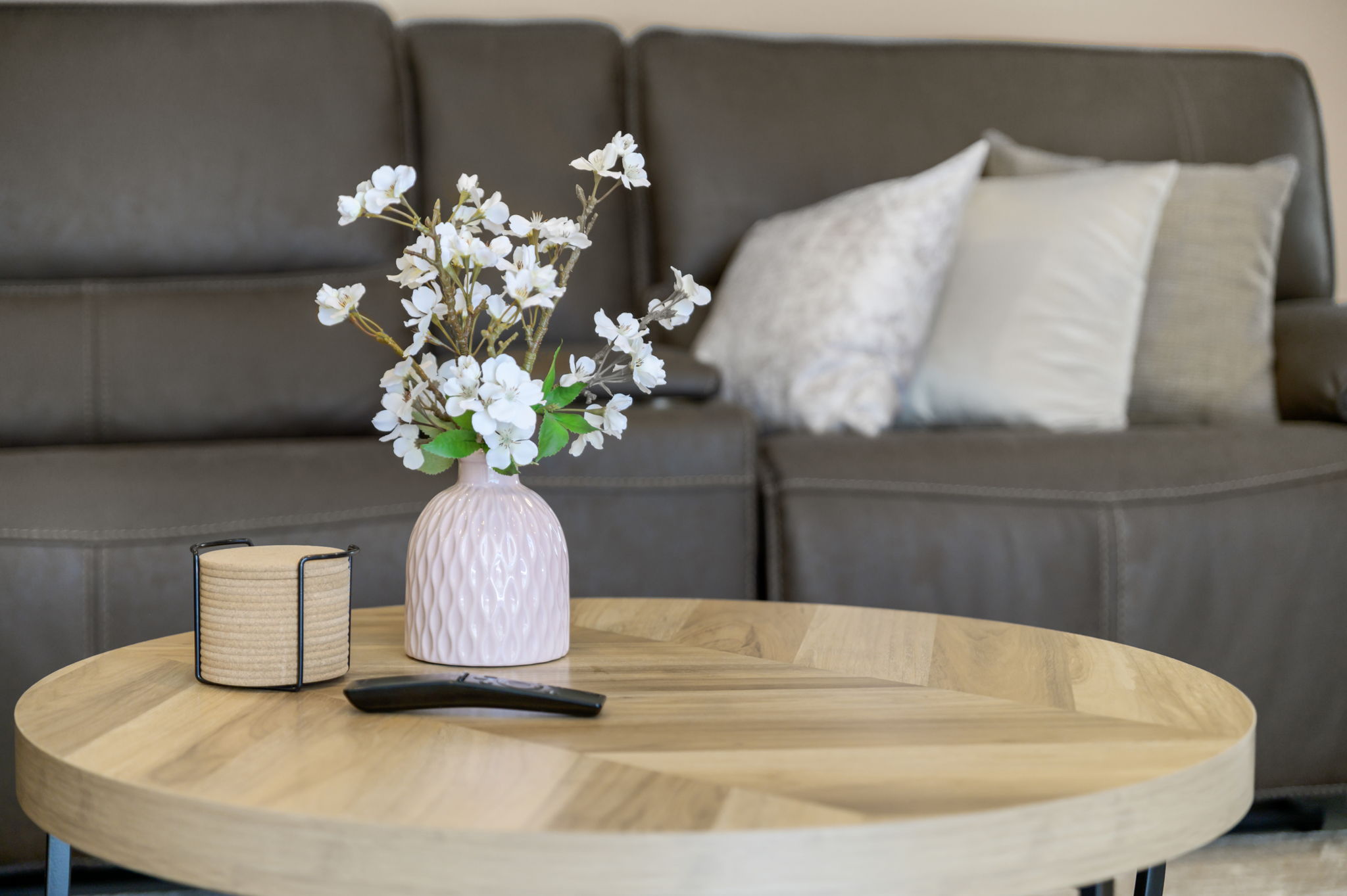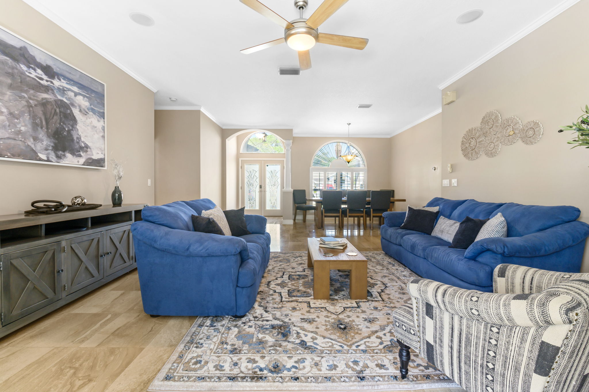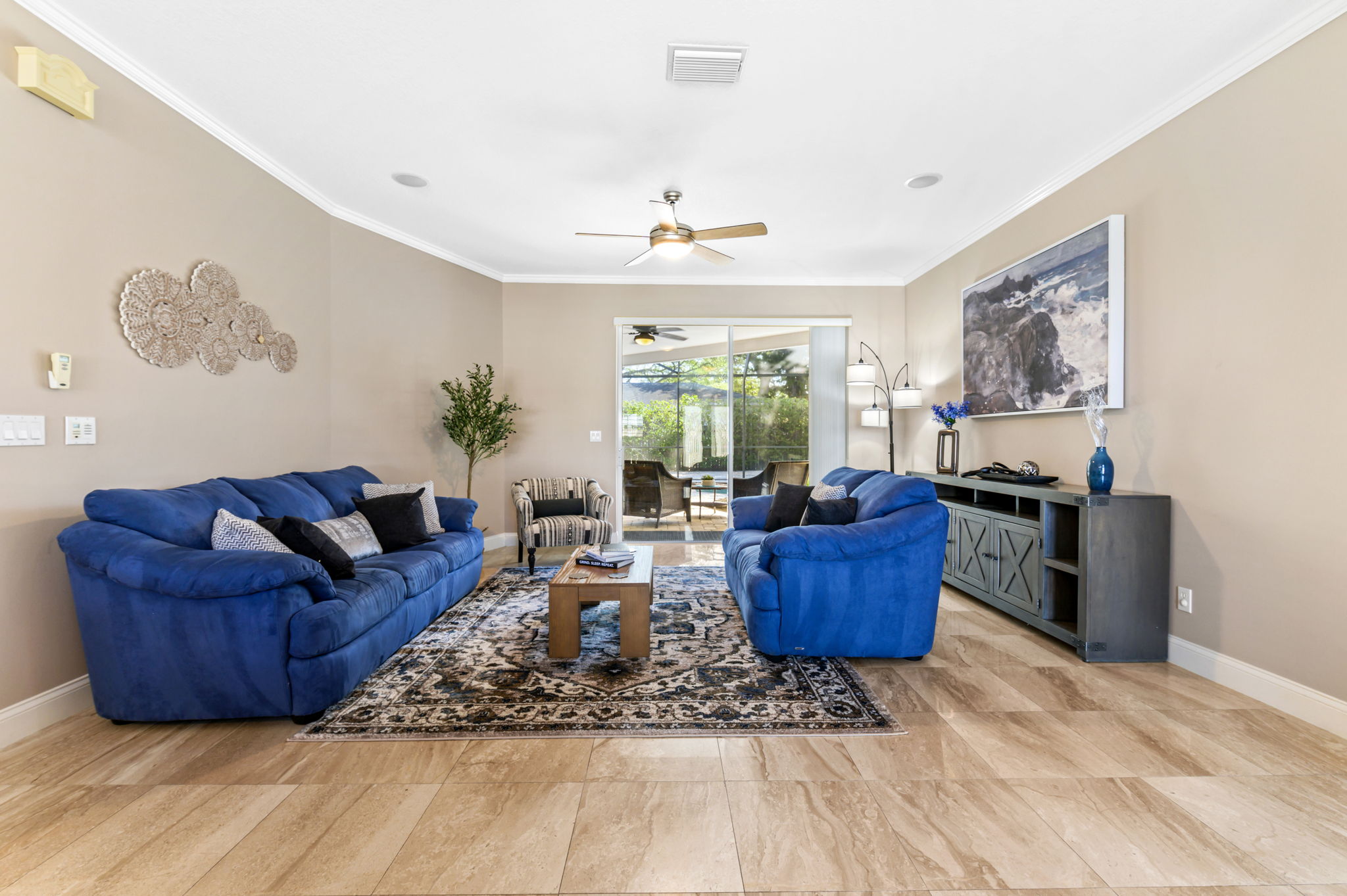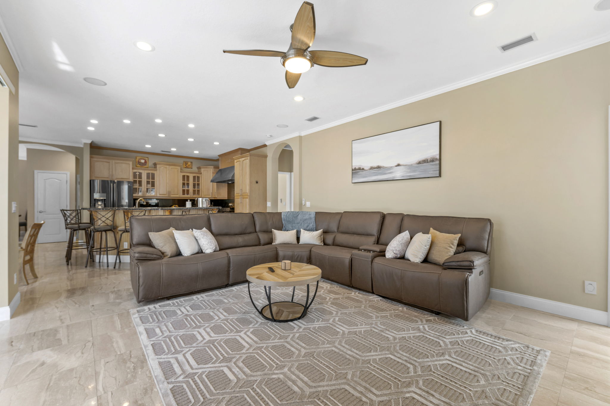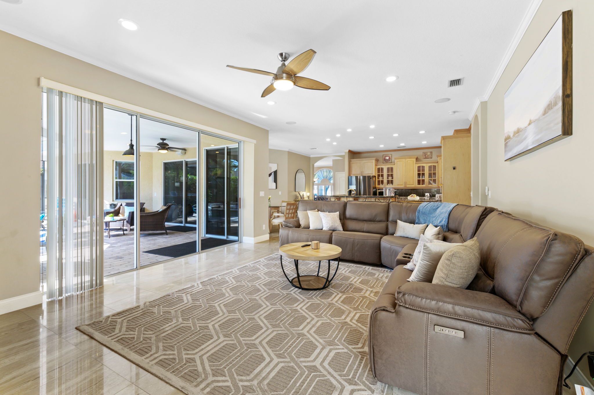 The living room of this home is designed for ultimate relaxation and quality time with loved ones. The ultra-comfortable sectional sofa beckon guests to sink in and unwind. An open-concept layout offers a direct view into the kitchen, seamlessly connecting spaces and facilitating entertainment. Adjacent sliding doors create a harmonious indoor-outdoor experience, allowing easy access to the backyard pool deck.
