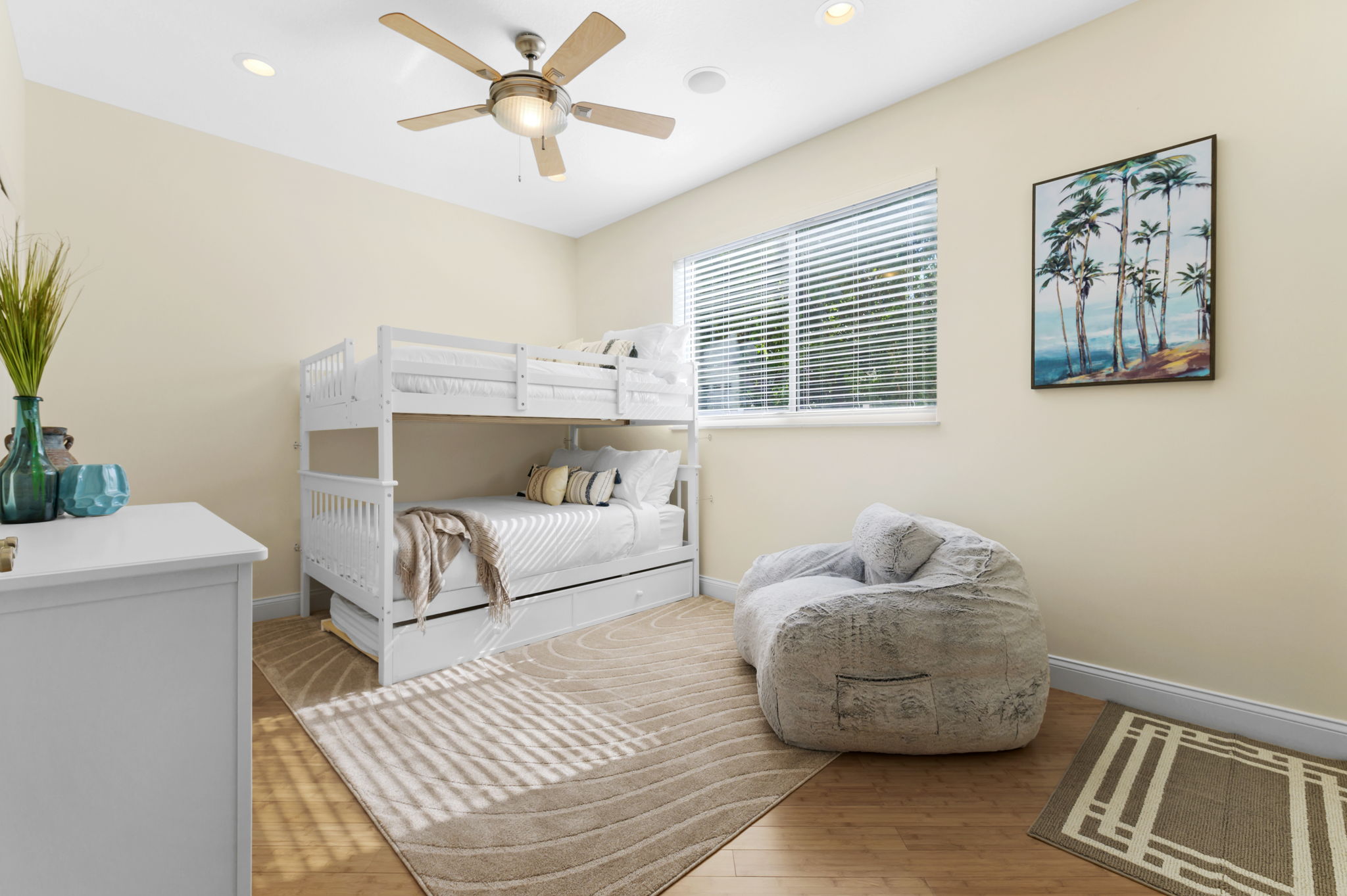 For the younger guests or the young at heart, the bunk room offers a playful ambiance with two full bunk beds and a twin trundle. This bedroom features its own en suite bathroom, perfect for quick refreshes after poolside adventures, equipped with a walk-in shower, toilet, and sink.