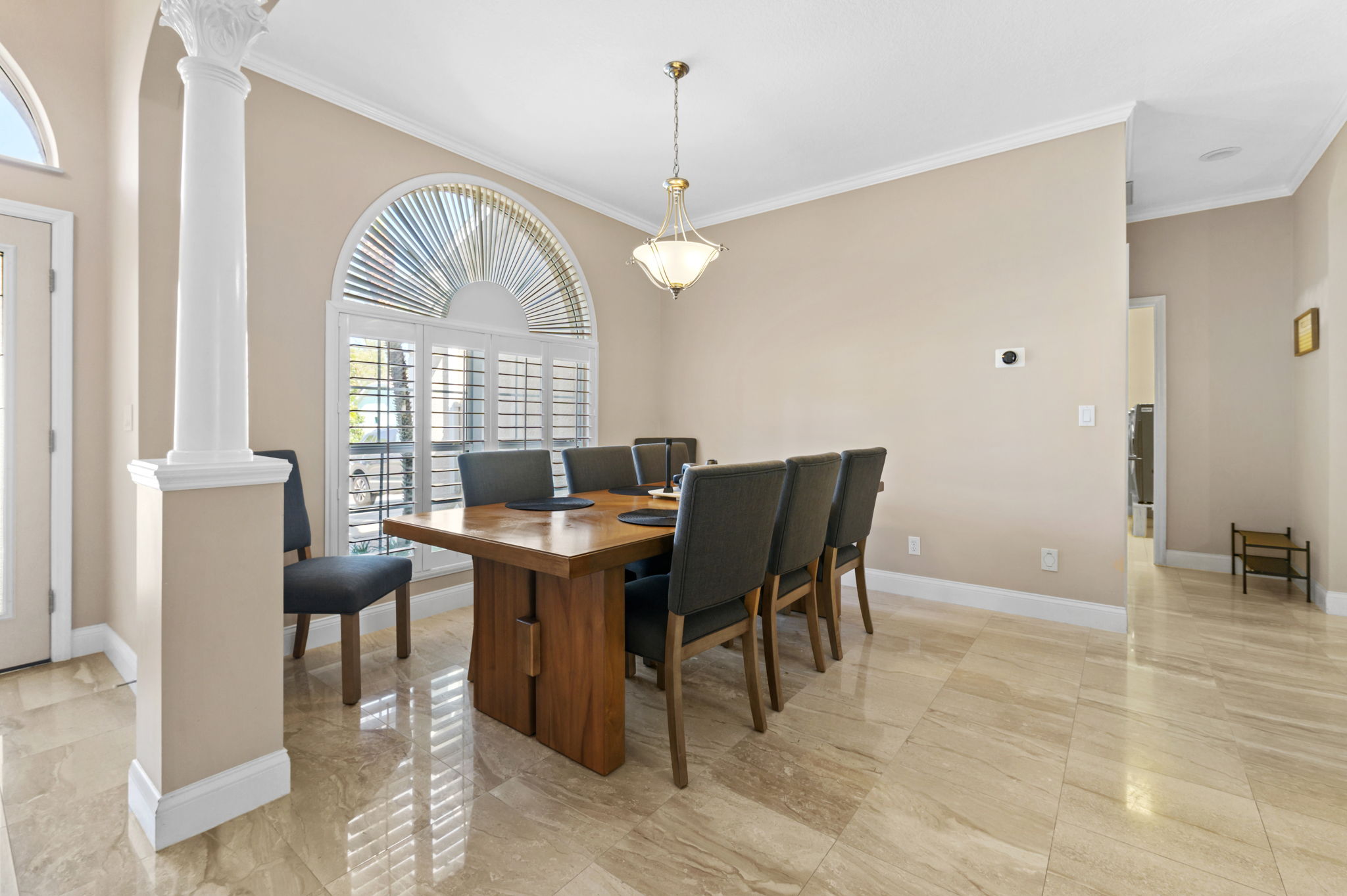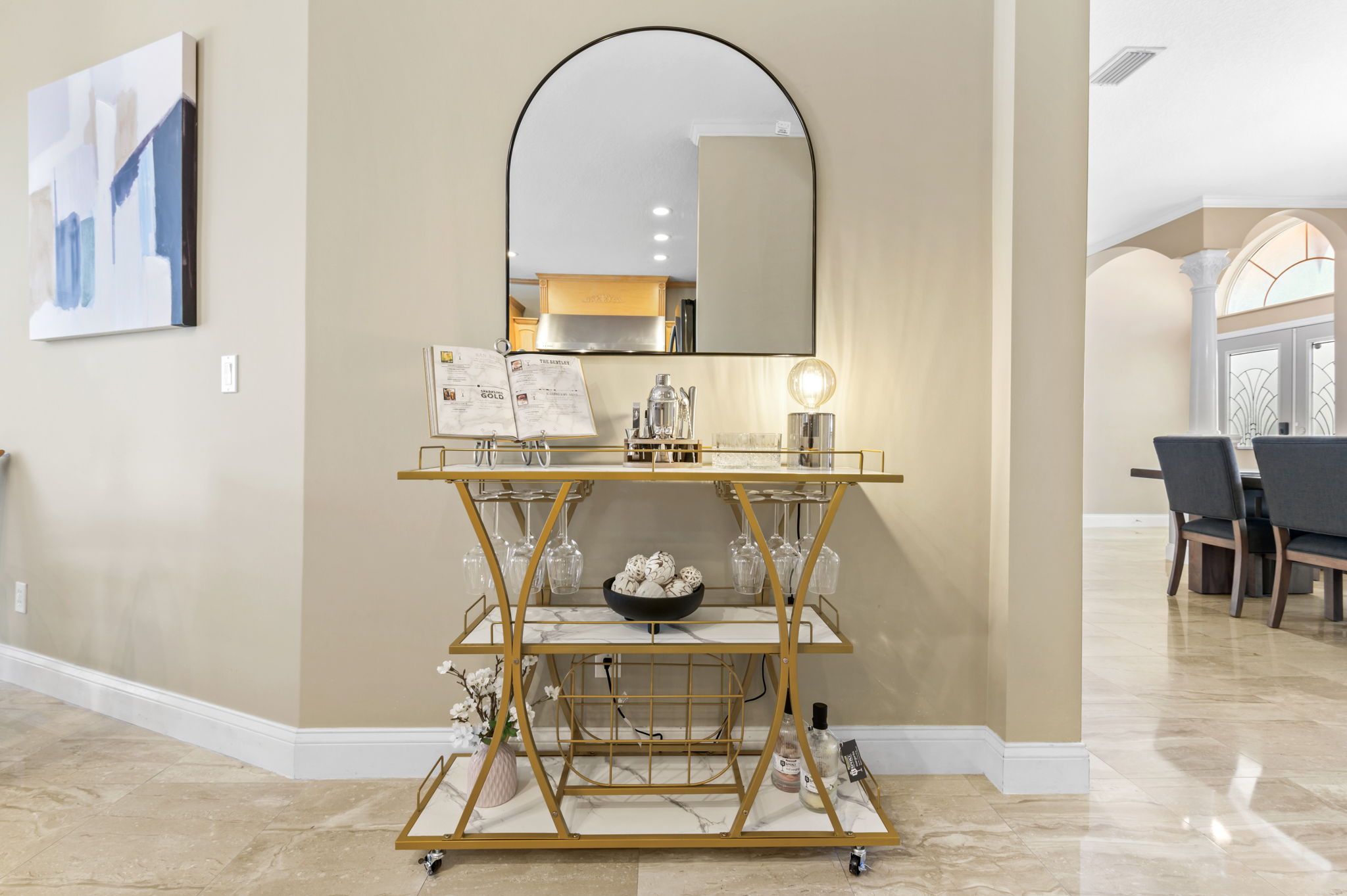 Next to the kitchen, the formal dining area awaits, capable of seating up to 8 guests. This elegant setting is perfect for shared meals and special occasions. Adjacent is a formal sitting area, furnished with ultra-comfortable sofas, ideal for intimate conversations and quality time. Together, these spaces create an inviting atmosphere for gatherings and entertainment.